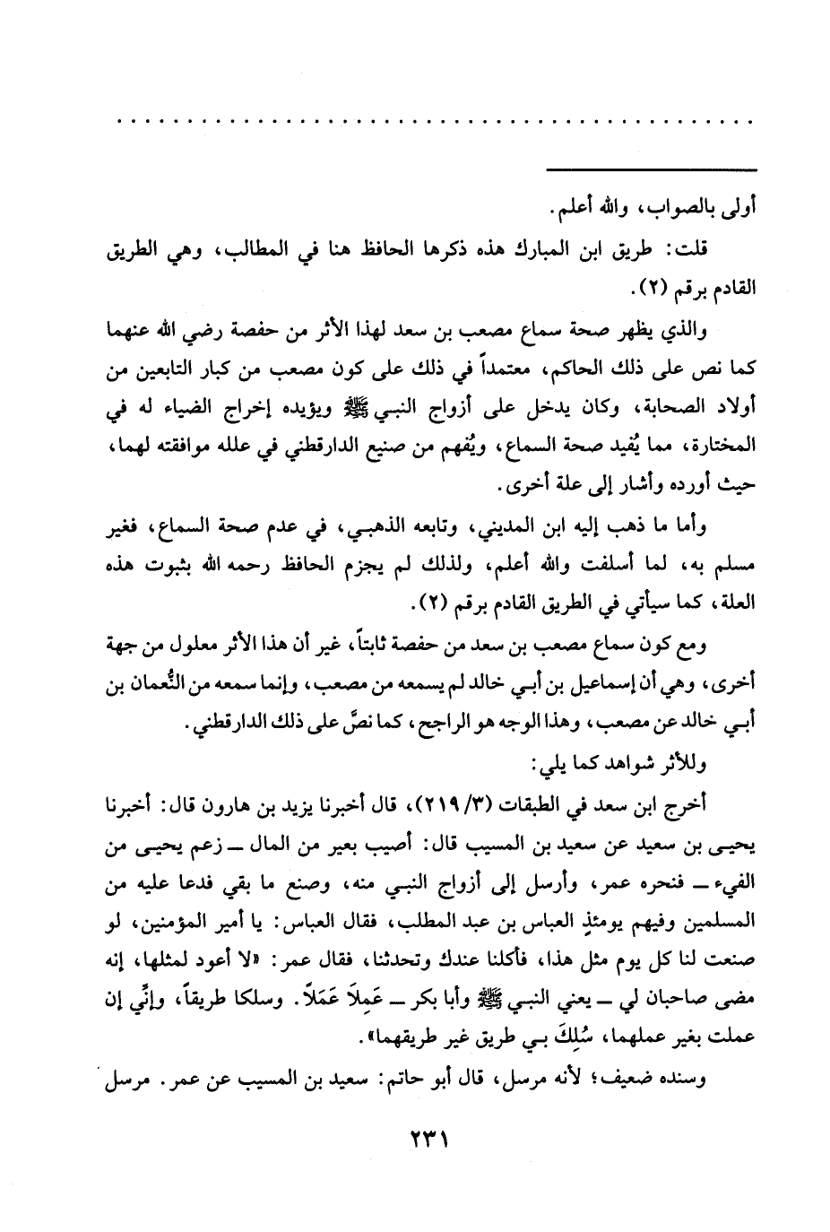 ومع كون سماع مصعب بن سعد من حفصة ثابتًا، غير أن هذا الأثر معلول من جهة أخرى، وهي أن إسماعيل بن أبي خالد لم يسمعه من مصعب، وإنما سمعه من النُّعمان بن أبي خالد عن مصعب، وهذا الوجه هو الراجح، كما نص على ذلك الدارقطني.