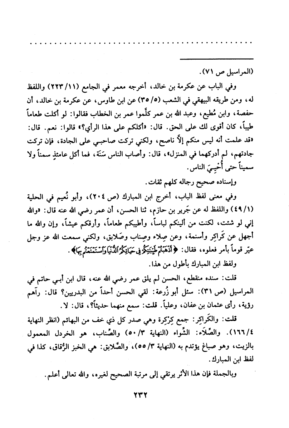 وفي معنى لفظ الباب، أخرج ابن المبارك (ص 204)، وأبو نُعيم في الحلية (1/ 49) واللفظ له عن جَرير بن حازم، ثنا الْحَسَنِ، أَنَّ عُمَرَ رَضِيَ اللَّهُ عَنْهُ قَالَ: "والله إني لو شئت، لكنت من ألينكم لباسًا، وأطيبكم طعامًا، وأرقكم عيشًا، وإن والله ما أجهل عن كَراكِر وأسنمة، وعن صِلاء وصِناب وصَلابق، ولكني سمعت الله عَزَّ وَجَلَّ عيّر قومًا بأمر فعلوه، فقال: {أَذْهَبْتُمْ طَيِّبَاتِكُمْ فِي حَيَاتِكُمُ الدُّنْيَا وَاسْتَمْتَعْتُمْ بِهَا}.