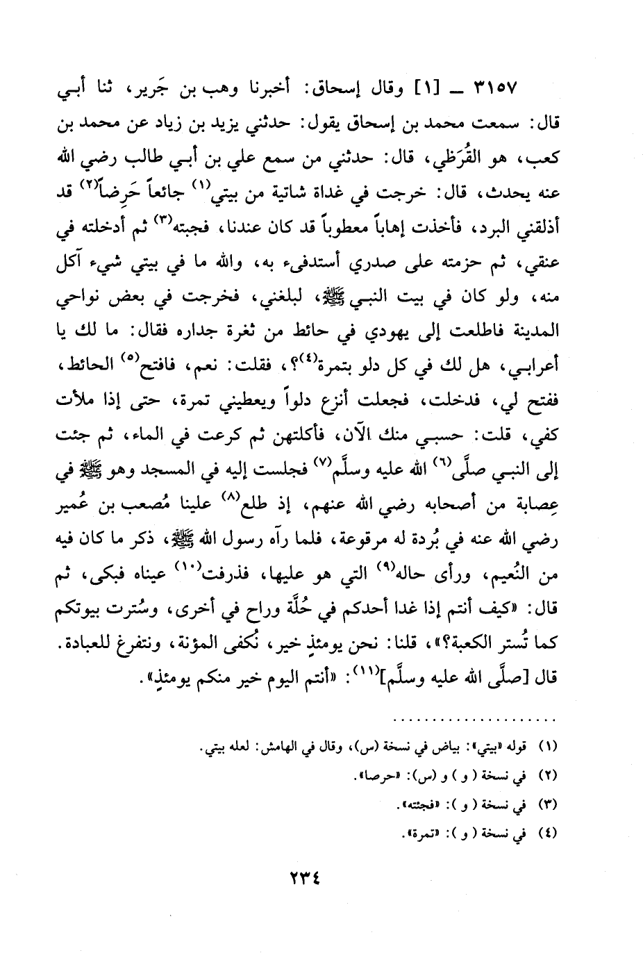 3157 -[1] وقَالَ إِسْحَاقُ: أخبرنا وَهْبُ بْنُ جَرِيرٍ، ثنا أبي قال: سَمِعْتُ مُحَمَّدَ بن إسحاق يقول: حَدَّثَنِي يَزِيدُ بْنُ زِيَادٍ عَنْ مُحَمَّدِ بْنِ كَعْبٍ، هُوَ القُرَظي، قال: حَدَّثَنِي مَنْ سَمِعَ عَلِيَّ بْنَ أَبِي طَالِبٍ رَضِيَ الله عَنْه يُحَدِّثُ، قَالَ: خَرَجْتُ فِي غَدَاةٍ شَاتِيَةٍ مِنْ بَيْتِي جَائِعًا حَرِضًا قَدْ أذلقني الْبَرْدُ، فَأَخَذْتُ إِهَابًا معطوباً قَدْ كَانَ عِنْدَنَا، فَجُبْتُهُ ثُمَّ أَدْخَلْتُهُ فِي عُنُقِي، ثُمَّ حَزَمْتُهُ عَلَى صَدْرِي أَسْتَدْفِئُ بِهِ، وَاللَّهِ ما فِي بَيْتِي شَيْءٌ آكُلُ مِنْهُ، وَلَوْ كَانَ فِي بَيْتِ النَّبِيِّ صَلَّى اللَّهُ عَلَيْهِ وَسَلَّمَ، لَبَلَغَنِي، فخرجت في بعض نَوَاحِي الْمَدِينَةِ فاطلعت إلى يهودي في حائط مِنْ ثُغْرَةِ جِدَارِهِ فَقَالَ: مَا لَكَ يَا أَعْرَابِيُّ، هَلْ لَكَ فِي كُلِّ دَلْوٍ بِتَمْرَةٍ؟ ، فَقُلْتُ: نَعَمْ، فَافْتَحِ الْحَائِطَ، فَفَتَحَ لي، فدخلت، فجعلت أَنْزِعُ دَلْوًا ويعطيني تمرة، حتى إذا مَلَأْتُ كَفِّي، قُلْتُ: حَسْبِي مِنْكَ الْآنَ، فَأَكَلْتُهُنَّ ثُمَّ كَرَعْتُ فِي الْمَاءِ، ثُمَّ جِئْتُ إِلَى النَّبِيِّ صَلَّى اللَّهُ عَلَيْهِ وَسَلَّمَ فَجَلَسْتُ إِلَيْهِ فِي الْمَسْجِدِ وَهُوَ صَلَّى اللَّهُ عَلَيْهِ وَسَلَّمَ فِي عِصَابَةٍ من أصحابه رَضِيَ الله عَنْهم، إذ طلع عَلَيْنَا مُصْعَبُ بْنُ عُمَيْرٍ رَضِيَ الله عَنْه فِي بُرْدَةٍ لَهُ مَرْقُوعَةٍ، فَلَمَّا رَآهُ رَسُولُ اللَّهِ صَلَّى اللَّهُ عَلَيْهِ وَسَلَّمَ، ذَكَرَ مَا كَانَ فِيهِ مِنَ النَّعِيمِ، وَرَأَى حَالَهُ الَّتِي هُوَ عَلَيْهَا، فَذَرَفَتْ عَيْنَاهُ فَبَكَى، ثُمَّ قال: " §كيف أنتم إِذَا غَدَا أَحَدُكُمْ فِي حُلَّةٍ وَرَاحَ فِي أُخْرَى، وَسُتِرَتْ بُيُوتُكُمْ كَمَا تُسْتَرُ الْكَعْبَةُ؟ "، قُلْنَا: نَحْنُ يَوْمَئِذٍ خَيْرٌ، نُكْفَى المؤنة، وَنَتَفَرَّغُ لِلْعِبَادَةِ. قَالَ [صَلَّى اللَّهُ عَلَيْهِ وَسَلَّمَ] : " أَنْتُمُ الْيَوْمَ خَيْرٌ مِنْكُمْ يَوْمَئِذٍ -[241]- ".