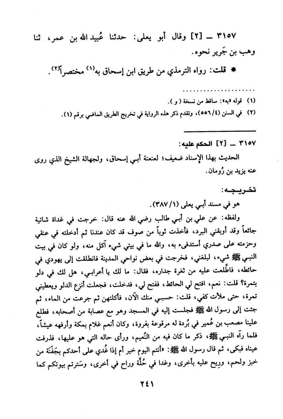 ولفظه: عن علي بن أبي طالب رضي الله عنه قال: خرجت في غداة شاتية جائعًا وقد أوبقني البرد، فأخذت ثوبًا من صوف قد كان عندنا ثم أدخلته في عنقي وحزمته على صدري أستدفىء به، والله ما فِي بَيْتِي شَيْءٌ آكُلُ مِنْهُ، وَلَوْ كَانَ فِي بَيْتِ النَّبِيِّ -صَلَّى اللَّهُ عَلَيْهِ وَسَلَّمَ- شيء، لبلغني، فخرجت في بعض نواحي المدينة فانطلقت إلى يهودي في حائطه، فاطّلعت عليه من ثغرة جداره، فقال: مالك يا أعرابي، هل لك في دلو بتمرة؟ قلت: نعم، افتح لي الحائط، ففتح لي، فدخلت، فجعلت أنزع الدلو ويعطيني تَمْرَةً، حَتَّى مَلَأْتُ كَفِّي، قُلْتُ: حَسْبِي مِنْكَ الآن، فأكلتهن ثم جرعت من الماء، ثم جئت إلى رسول الله -صلى الله عليه وسلم- فجلست إليه في المسجد وهو مع عصابة من أصحابه، فطلع عَلَيْنَا مُصْعَبُ بْنُ عُمير فِي بُردة لَهُ مرقوعة بفروة، وكان أنعم غلام بمكة وأرفهه عيشًا، فلما رآه النبي -صَلَّى اللَّهُ عَلَيْهِ وَسَلَّمَ-، ذَكَرَ مَا كَانَ فِيهِ مِنَ النَّعِيمِ، وَرَأَى حَالَهُ الَّتِي هُوَ عليها، فذرفت عيناه فبكى، ثُمَّ قَالَ رَسُولُ اللَّهِ -صَلَّى اللَّهُ عَلَيْهِ وسلم-:"أنتم اليوم خير أم إذا غُدي على أحدكم بجفْنَة من خبز ولحم، ورِيح عليه بأخرى، وغدا في حُلَّة وراح في أخرى، وسَترتم بيوتكم كما =