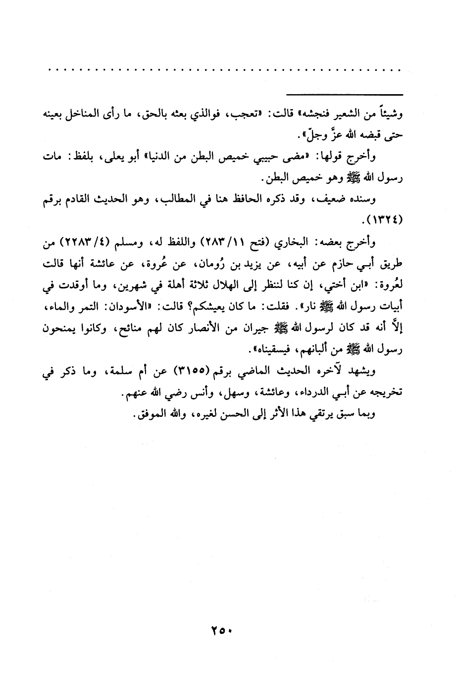 وأخرج قولها: "مضى حبيبي خميص البطن من الدنيا" أبو يعلى، بلفظ: مَاتَ رَسُولُ اللَّهِ -صَلَّى اللَّهُ عَلَيْهِ وَسَلَّمَ- وهو خميص البطن.