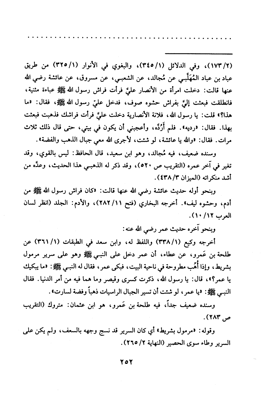 = (2/ 173)، وفي الدلائل (1/ 345)، والبغويّ في الأنوار (1/ 325) من طريق عباد بن عباد المُهَلَّبي عن مُجالد، عن الشعبي، عن مسروق، عَنْ عَائِشَةَ رَضِيَ اللَّهُ عَنْهَا قَالَتْ: دَخَلْتُ امرأة من الأنصار عليَّ فرأت فِرَاشُ رَسُولِ اللَّهِ -صَلَّى اللَّهُ عَلَيْهِ وَسَلَّمَ- عباءة مثنية، فانطلقت فبعثت إليَّ بفراش حشوه صوف، فَدَخَلَ عَلَى رَسُولِ اللَّهِ -صَلَّى اللَّهُ عَلَيْهِ وسلم-، فقال: "ما هذا؟ " قلت: يا رسول الله، فلانة الأنصارية دخلت عليَّ فرأت فراشك فذهبت فبعثت بهذا. فقال: "رديه". فلم أَرُدَّة، وأعجبني أن يكون في بيتي، حتى قال ذلك ثلاث مرات. فقال: "والله يا عائشة، لو شئت، لأجرى الله معي جبال الذهب والفضة".