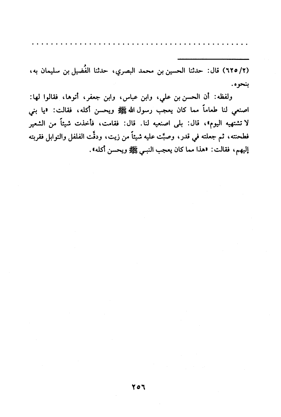 ولفظه: أن الحسن بن علي، وابن عباس، وابن جعفر، أتوها، فقالوا لها: اصنعي لنا طعامًا مما كان يعجب رسول الله -صلى الله عليه وسلم- ويحسن أكله، فقالت: "يا بني لا تشتهيه اليوم"، قال: بلى اصنعيه لنا. قال: فقامت، فأخذت شيئًا من الشعير فطحنته، ثم جعلته في قدر، وصبَّت عليه شيئًا من زيت، ودّقَّت الفلفل والتوابل فقربته إليهم، فقالت: "هذا مما كان يعجب النبي -صلى الله عليه وسلم- ويحسن أكله".