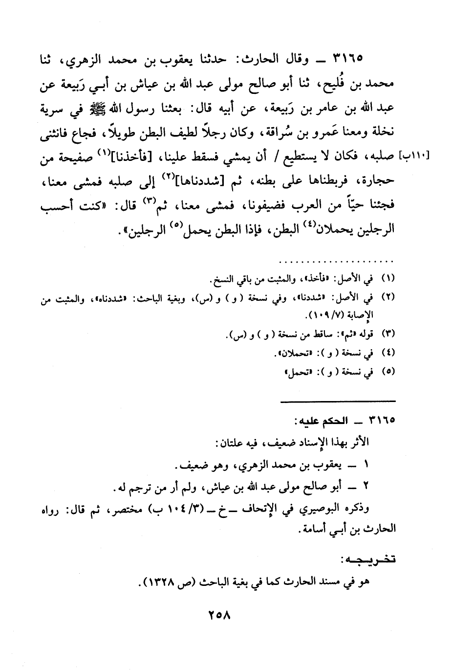 3165 - وقال الْحَارِثُ: حدثنا يَعْقُوبُ بْنُ مُحَمَّدٍ الزُّهْرِيُّ، ثنا مُحَمَّدُ بْنُ فُلَيْحٍ، ثنا أَبُو صَالِحٍ مَوْلَى عَبْدِ اللَّهِ بْنِ عَيَّاشِ بْنِ أَبِي رَبِيعَةَ عَنْ عَبْدِ اللَّهِ بْنِ عَامِرِ بْنِ رَبِيعَةَ، عَنْ أَبِيهِ قال: بعثنا رسول الله صَلَّى اللَّهُ عَلَيْهِ وَسَلَّمَ في سرية نخلة وَمَعَنَا عَمْرُو بْنُ سُرَاقَةَ، وَكَانَ رَجُلًا لَطِيفَ الْبَطْنِ طَوِيلًا، §فَجَاعَ فَانْثَنَى صُلْبُهُ، فَكَانَ لَا يَسْتَطِيعُ / أَنْ يَمْشِيَ فَسَقَطَ عَلَيْنَا، [فَأَخَذْنَا] صفيحة مِنْ حِجَارَةٍ، فَرَبَطْنَاهَا عَلَى بَطْنِهِ، ثُمَّ [شددناها] إِلَى صُلْبِهِ فَمَشَى مَعَنَا، فَجِئْنَا حَيًّا مِنَ الْعَرَبِ فَضَيَّفُونَا، فمشى معنا، ثم قَالَ: " كُنْتُ أَحْسَبُ الرجلين يَحْمِلَانِ الْبَطْنَ، فَإِذَا الْبَطْنُ يَحْمِلُ الرِّجْلَيْنِ ".