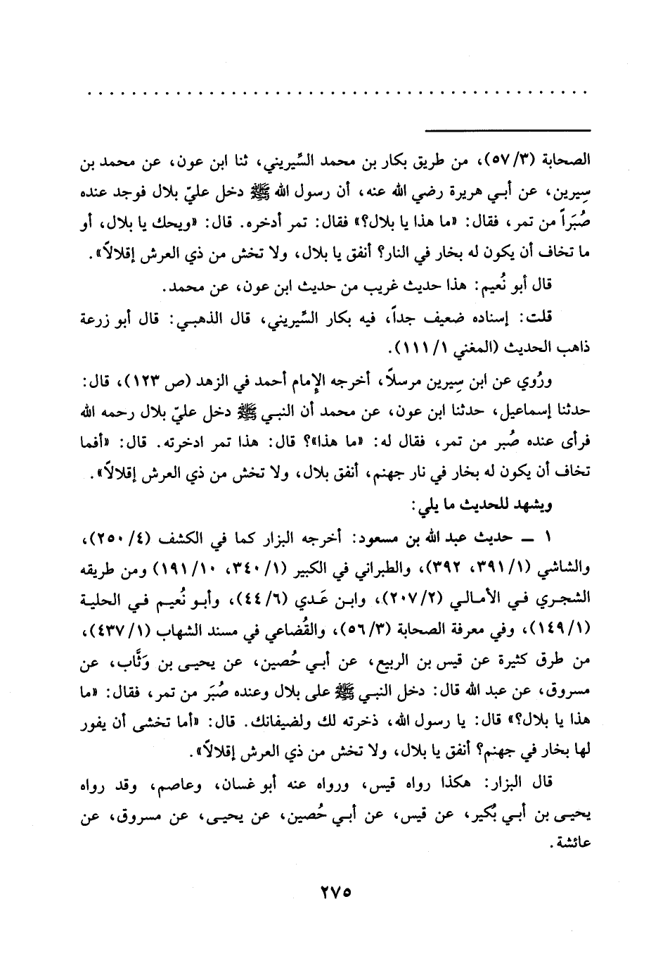 1 - حديث عبد الله بن مسعود: أخرجه البزّار كما في الكشف (4/ 250)، والشاشي (1/ 391، 392)، والطبراني في الكبير (1/ 340، 10/ 191) ومن طريقه الشجري في الأمالي (2/ 207) -، وابن عَدي (6/ 44)، وأبو نُعيم في الحلية (1/ 149)، وفي معرفة الصحابة (3/ 56)، والقُضاعي في مسند الشهاب (1/ 437)، من طرق كثيرة عن قيس بن الربيع، عن أبي حُصين، عن يحيى بن وَثَّاب، عن مسروق، عن عبد الله قَالَ: دَخَلَ النَّبِيُّ -صَلَّى اللَّهُ عَلَيْهِ وَسَلَّمَ- على بلال وعنده صُبَر مِنْ تَمْرٍ، فَقَالَ: "مَا هَذَا يَا بِلَالُ؟ " قال: يا رسول الله، ذخرته لك ولضيفانك. قال: "أما تخشى أن يفور لها بخار في جهنم؟ أنفق يا بلال، ولا تخش من ذي العرش إقلالًا".