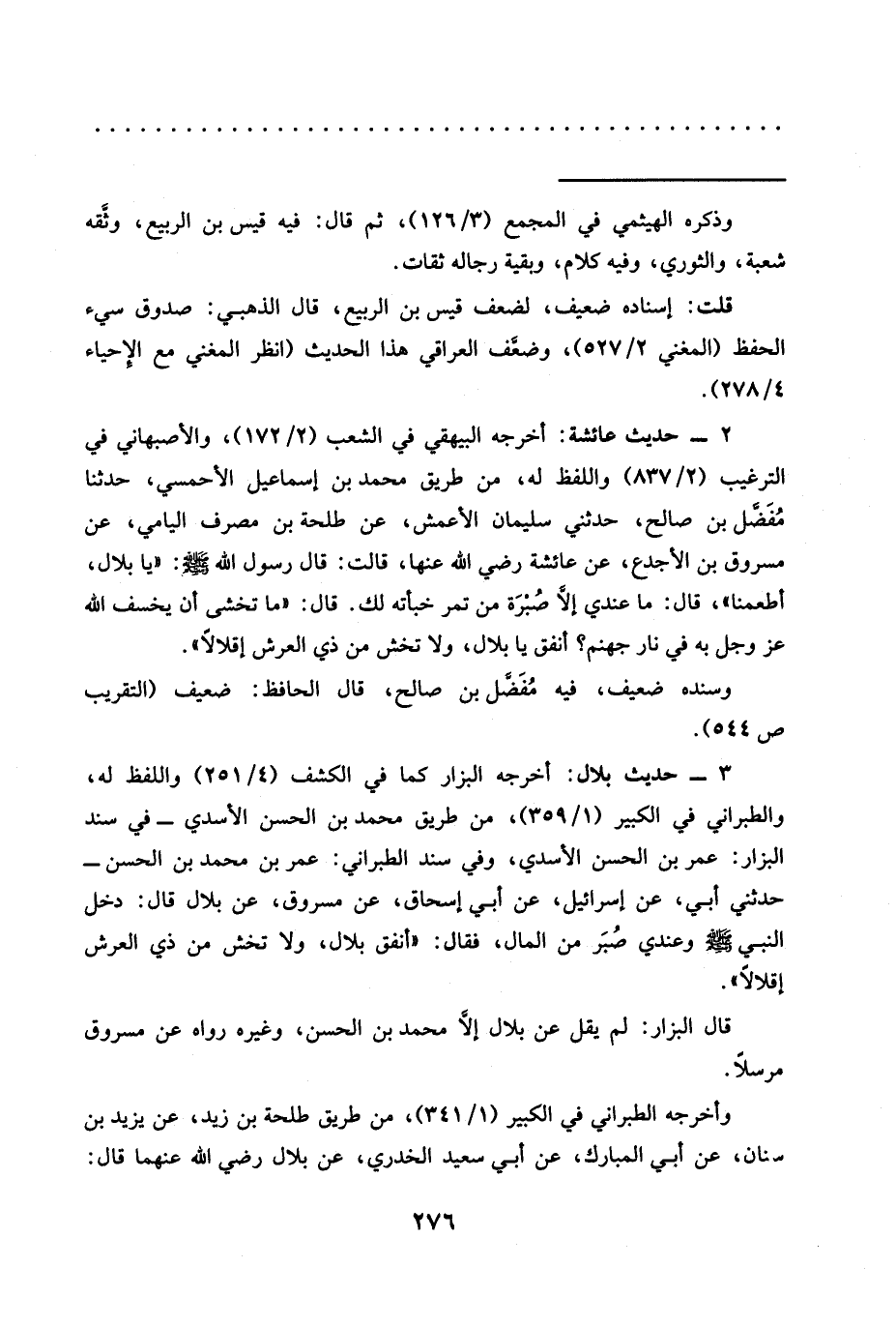2 - حديث عائشة: أخرجه البيهقي في الشعب (2/ 172)، والأصبهاني في الترغيب (2/ 837) واللفظ له، من طريق محمَّد بن إسماعيل الأحمسي، حدّثنا مُفَضَّل بن صالح، حدثني سليمان الأعمش، عن طلحة بن مصرف اليامي، عن مسروق بن الأجدع، عن عائشة رضي الله عنها، قَالَتْ: قَالَ رَسُولُ اللَّهِ -صَلَّى اللَّهُ عَلَيْهِ وَسَلَّمَ-: "يَا بلال، أطعمنا"، قال: ما عندي إلَّا صُبْرَة من تمر خبأته لك. قال: "ما تخشى أن يخسف الله عَزَّ وَجَلَّ به في نار جهنم؟ أنفق يا بلال، ولا تخش من ذي العرش إقلالًا".