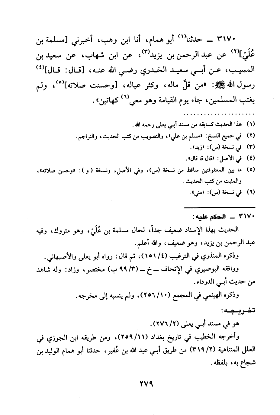 3170 - حَدَّثَنَا أَبُو هَمَّامٍ، أنا ابْنُ وهب، أخبرني [مسلمة بْنُ عَلِيٍّ] عَنْ عَبْدِ الرَّحْمَنِ بْنِ يَزِيدَ، عَنِ ابْنِ شِهَابٍ، عَنْ سَعِيدِ بْنِ الْمُسَيِّبِ، عَنْ أَبِي سَعِيدٍ الْخُدْرِيِّ رَضِيَ الله عَنْه، [قَالَ: قَالَ] رَسُولُ اللَّهِ صَلَّى اللَّهُ عَلَيْهِ وَسَلَّمَ: " §مَنْ قَلَّ ماله، وكثرعياله، [وحسنت صَلَاتَهُ] ، وَلَمْ يَغْتَبِ الْمُسْلِمِينَ، جَاءَ يَوْمَ الْقِيَامَةِ وَهُوَ مَعِي كَهَاتَيْنِ ".