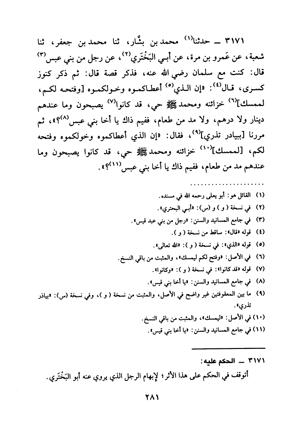 3171 - حدثنا مُحَمَّدُ بْنُ بَشَّارٍ، ثنا مُحَمَّدُ بْنُ جَعْفَرٍ، ثنا شُعْبَةُ، عَنْ عَمْرِو بْنِ مُرَّةَ، عَنْ أَبِي الْبَخْتَرِيِّ، عَنْ رَجُلٍ مِنْ بَنِي عَبْسٍ قَالَ: كُنْتُ مَعَ سَلْمَانَ رَضِيَ الله عَنْه، فَذَكَرَ قِصَّةً قَالَ: ثُمَّ ذَكَرَ كُنُوزَ كِسْرَى، قَالَ: " §إِنَّ الَّذِي أَعْطَاكُمُوهُ وَخَوَّلَكُمُوهُ [وَفَتَحَهُ لَكُمْ، لِمُمْسِكٌ] خَزَائِنَهُ وَمُحَمَّدٌ صَلَّى اللَّهُ عَلَيْهِ وَسَلَّمَ حَيٌّ، قَدْ كَانُوا يُصْبِحُونَ وَمَا عِنْدَهُمْ دِينَارٌ وَلَا دِرْهَمٌ، وَلَا مُدٌّ مِنْ طَعَامٍ، فَفِيمَ ذَاكَ يَا أَخَا بَنِي عَبْسٍ؟ "، ثُمَّ مَرَرْنَا [بِبَيَادِرَ تُذْرَى] ، فَقَالَ: " إِنَّ الَّذِيَ أَعْطَاكُمُوهُ وخولكمموه وَفَتَحَهُ لَكُمْ، [لِمُمْسِكٌ] خَزَائِنَهُ وَمُحَمَّدٌ صَلَّى اللَّهُ عَلَيْهِ وَسَلَّمَ حَيٌّ، قَدْ كَانُوا يُصْبِحُونَ وَمَا عندهم مد من طَعَامٍ، فَفِيمَ ذَاكَ يَا أَخَا بَنِي عَبْسٍ؟ ".