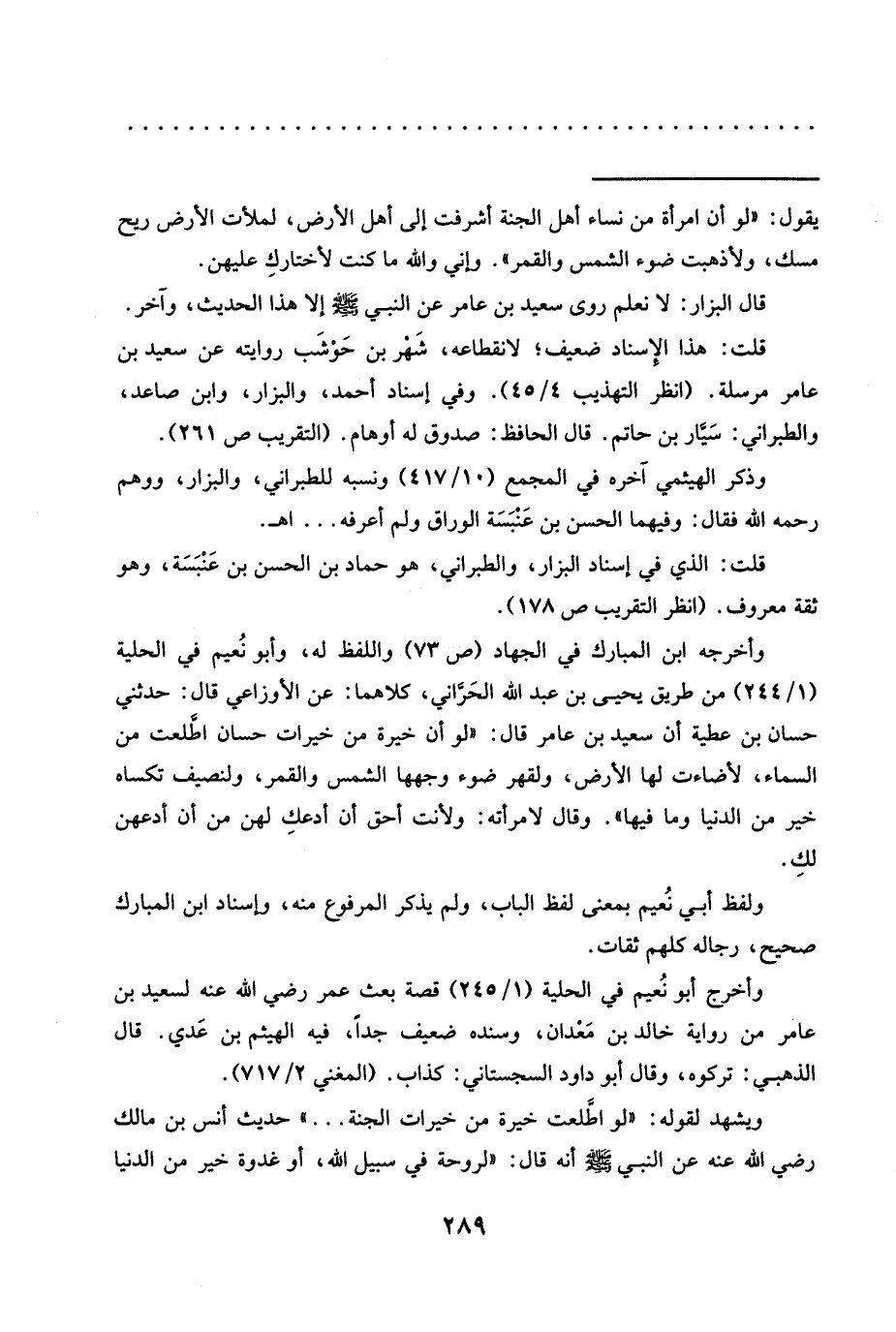 وأخرجه ابن المبارك في الجهاد (ص 73) واللفظ له، وأبو نُعيم في الحلية (1/ 244) من طريق يحيى بن عبد الله الحَرَّاني، كلاهما: عن الأوزاعي قال: حدثني حسان بن عطية أن سعيد بن عامر قال: "لو أن خيرة من خيرات حسان اطّلعت من السماء، لأضاءت لها الأرض، ولقهر ضوء وجهها الشمس والقمر، ولنصيف تكساه خير من الدنيا وما فيها". وقال لامرأته: ولأنت أحق أن أدعكِ لهن من أن أدعهن لك.