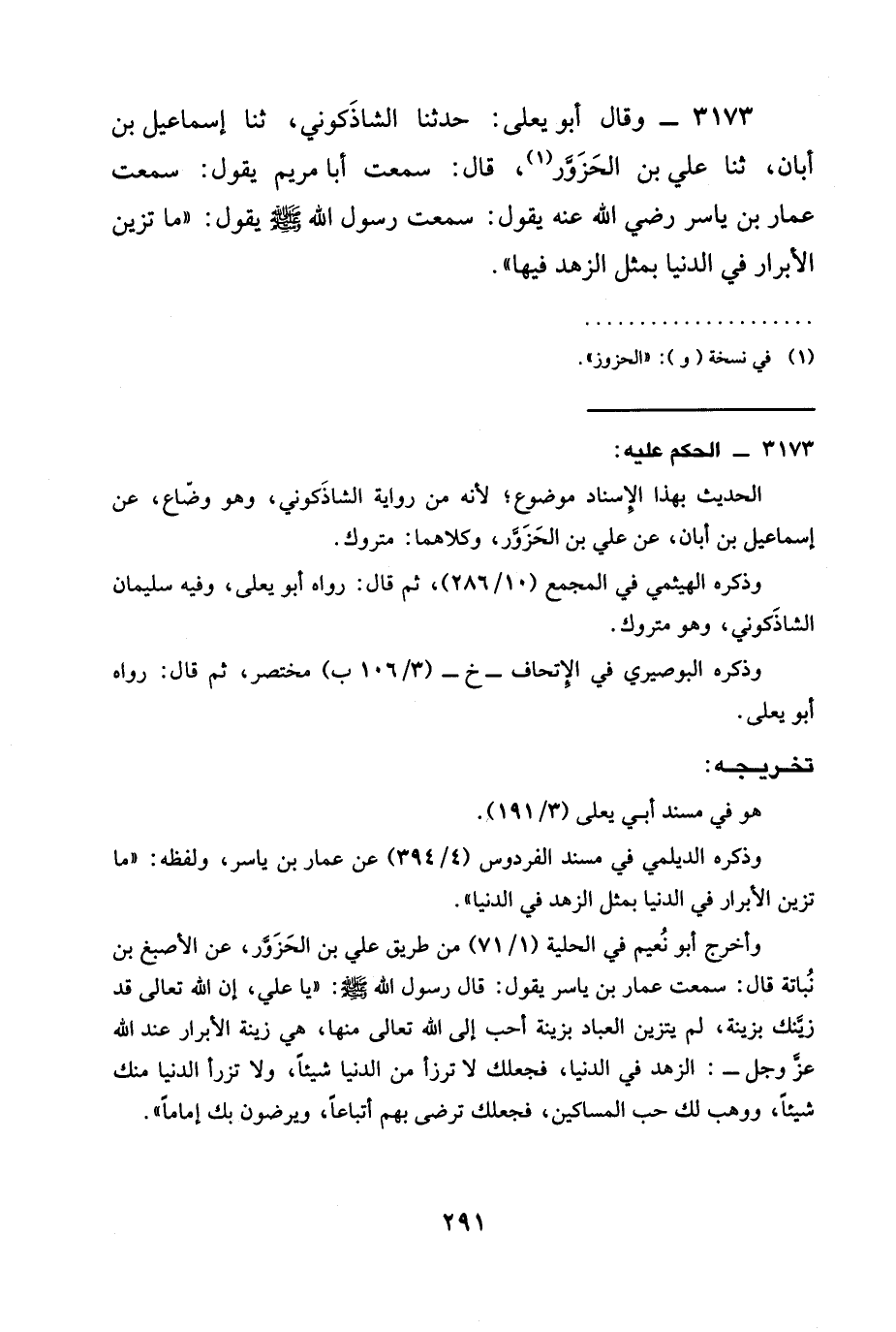 3173 - وقال أَبُو يَعْلَى: حدثنا الشَّاذَكُونِيُّ، ثنا إِسْمَاعِيلُ بْنُ أَبَانَ، ثنا عَلِيُّ بن الحزور، قال: سَمِعْتُ أَبَا مريم يقول: سَمِعْتُ عَمَّارَ بْنَ ياسر رَضِيَ الله عَنْه يقول: سَمِعْتُ رَسُولَ اللَّهِ صَلَّى اللَّهُ عَلَيْهِ وَسَلَّمَ يَقُولُ: " §مَا تَزَيَّنَ الْأَبْرَارُ فِي الدُّنْيَا بِمِثْلِ الزُّهْدِ فِيهَا ".