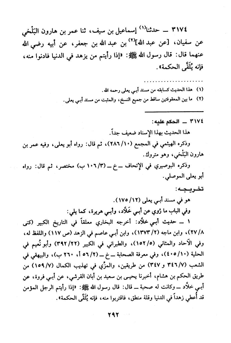 3174 - حَدَّثَنَا إسماعيل بن سيف، ثنا عُمَرُ بْنُ هَارُونَ البلخي عَنْ سُفْيَانَ، [عَنْ عَبْدِ اللَّهِ] بْنِ عَبْدِ اللَّهِ بْنِ جَعْفَرٍ، عن أبيه رَضِيَ الله عَنْهما قَالَ: قَالَ رَسُولُ اللَّهِ صَلَّى اللَّهُ عَلَيْهِ وَسَلَّمَ: " §إِذَا رَأَيْتُمْ مَنْ يَزْهَدُ فِي الدُّنْيَا فَادْنُوا مِنْهُ، فَإِنَّهُ يُلَقَّى الْحِكْمَةَ ".