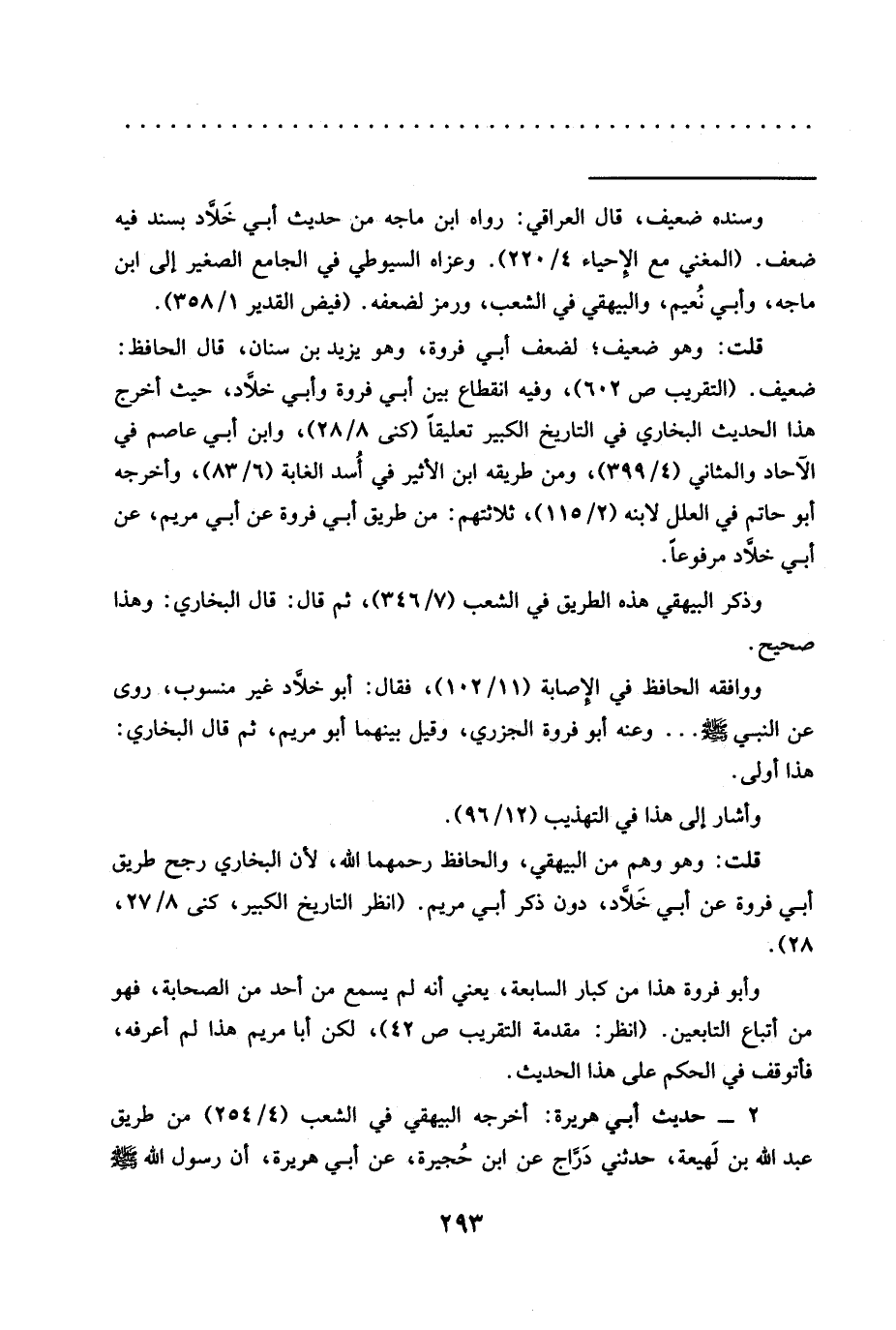 قلت: وهو وهم من البيهقي، والحافظ رحمهما الله؛ لأنّ البخاريُّ رجح طريق أبي فروة عن أبي خَلَّاد، دون ذكر أبي مريم. (انظر التاريخ الكبير، كنى 8/ 27، 28).