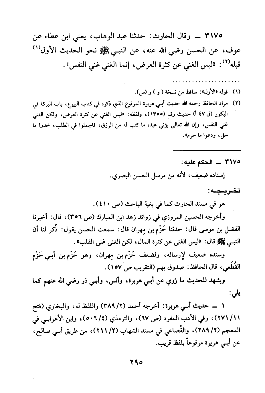 3175 - وقال الْحَارِثُ: حدثنا عَبْدُ الْوَهَّابِ، يَعْنِي ابْنَ عَطَاءٍ عَنْ عَوْفٍ، عَنِ الْحَسَنِ رَضِيَ الله عَنْه، عن النبي صَلَّى اللَّهُ عَلَيْهِ وَسَلَّمَ نحو الحديث الأول قبله: " §لَيْسَ الْغِنَى عَنْ كَثْرَةِ الْعَرَضِ، إِنَّمَا الْغِنَى غِنَى النَّفْسِ ".