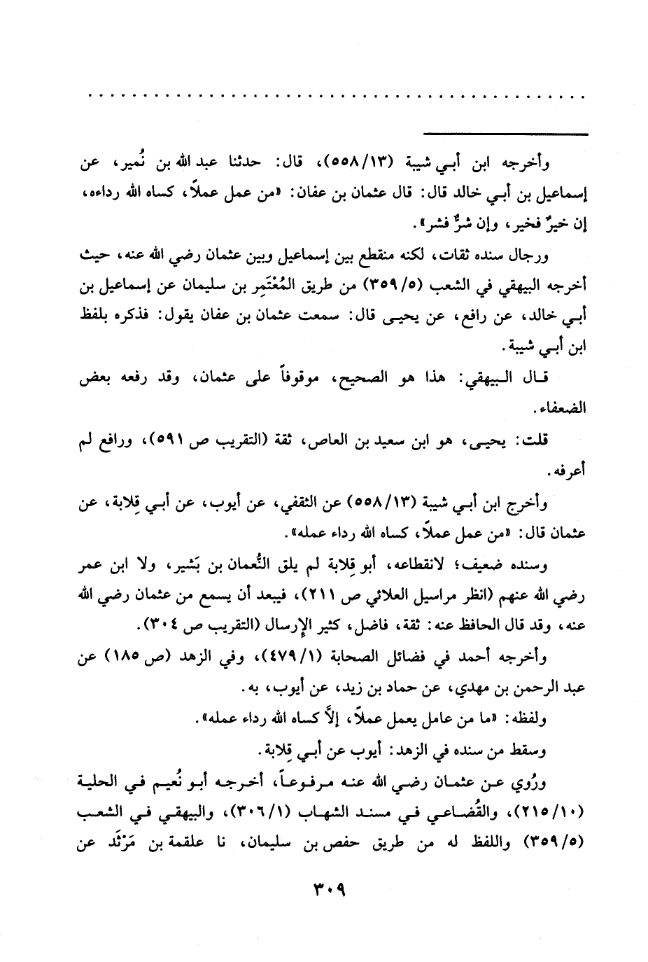 ورجال مسنده ثقات، لكنه منقطع بين إسماعيل وبين عثمان رضي الله عنه، حيث أخرجه البيهقي في الشعب (5/ 359) من طريق المُعْتَمِر بن سليمان عن إسماعيل بن أبي خالد، عن رافع، عن يحيى قال: سمعت عثمان بن عفان يقول: فذكره بلفظ ابن أبي شيبة.
