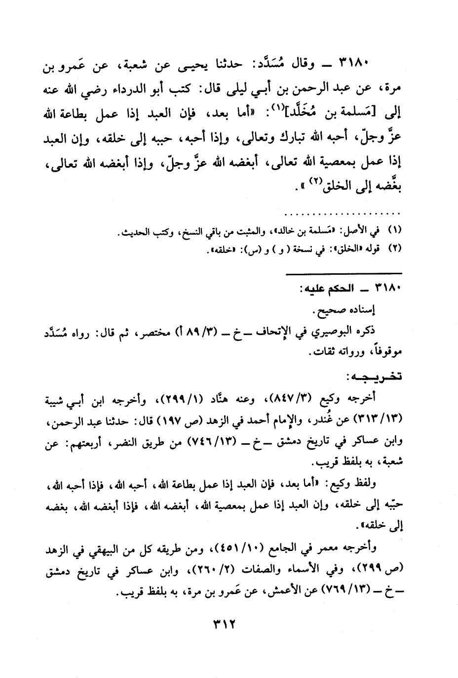 3180 - وقال مُسَدَّدٌ: حدثنا يحيى عن شعبة، عَنْ عَمْرِو بْنِ مُرَّةَ، عَنْ عَبْدِ الرَّحْمَنِ بْنِ أبي ليلى قال: كَتَبَ أَبُو الدَّرْدَاءِ رَضِيَ الله عَنْه إِلَى [مَسْلَمَةَ بْنِ مَخْلَدٍ] : " أَمَّا بَعْدُ، §فَإِنَّ الْعَبْدَ إِذَا عَمِلَ بطاعة الله عزَّ وجلّ، أحبه الله تبارك وتعالى، وَإِذَا أَحَبَّهُ، حَبَّبَهُ إِلَى خَلْقِهِ، وَإِنَّ الْعَبْدَ إِذَا عَمِلَ بِمَعْصِيَةِ اللَّهِ تعالى، أَبْغَضَهُ اللَّهُ عزَّ وجلّ، وَإِذَا أَبْغَضَهُ الله تعالى، بغَّضه إلى الخلق ".
