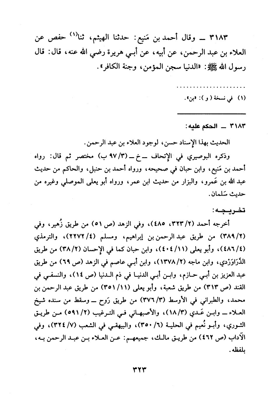 3183 - وقال أَحْمَدُ بْنُ مَنِيعٍ: حدثنا الهيثم، ثنا حَفْصٌ عَنِ الْعَلَاءِ بْنِ عَبْدِ الرَّحْمَنِ، عَنْ أَبِيهِ، عَنْ أَبِي هُرَيْرَةَ رَضِيَ الله عَنْه، قَالَ: قَالَ رَسُولُ اللَّهِ صَلَّى اللَّهُ عَلَيْهِ وَسَلَّمَ: " §الدُّنْيَا سِجْنُ الْمُؤْمِنِ، وَجَنَّةُ الْكَافِرِ ".