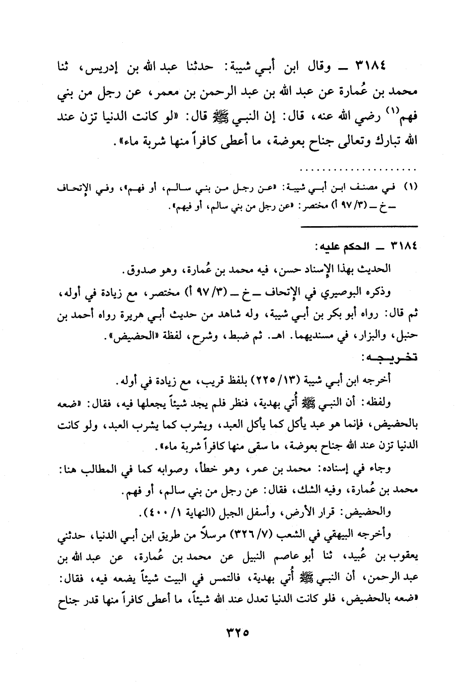 3184 - وقال ابْنُ أَبِي شَيْبَةَ: حدثنا عَبْدُ اللَّهِ بْنُ إِدْرِيسَ، ثنا مُحَمَّدُ بْنُ عُمَارَةَ عَنْ عَبْدِ اللَّهِ بْنِ عَبْدِ الرَّحْمَنِ بْنِ مَعْمَرٍ، عَنْ رَجُلٍ مِنْ بَنِي فَهْمٍ رَضِيَ الله عَنْه، قال: أَنَّ النَّبِيَّ صَلَّى اللَّهُ عَلَيْهِ وَسَلَّمَ قَالَ: " §لَوْ كَانَتِ الدُّنْيَا تَزِنُ عند الله تبارك وتعالى جَنَاحَ بَعُوضَةٍ، مَا أَعْطَى كَافِرًا مِنْهَا شَرْبَةَ مَاءٍ ".