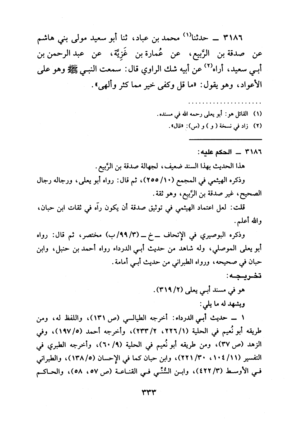 3186 - حَدَّثَنَا مُحَمَّدُ بْنُ عَبَّادٍ، ثنا أَبُو سَعِيدٍ مَوْلَى بَنِي هَاشِمٍ عَنْ صَدَقَةَ بْنِ الرَّبِيعِ، عَنْ عُمَارَةَ بْنِ غَزِيَّةَ، عَنْ عَبْدِ الرَّحْمَنِ بْنِ أَبِي سَعِيدٍ، أُرَاهُ عَنْ أَبِيهِ شك الراوي قال: سمعت النبي صَلَّى اللَّهُ عَلَيْهِ وَسَلَّمَ وَهُوَ عَلَى الْأَعْوَادِ، وَهُوَ يَقُولُ: " §مَا قَلَّ وَكَفَى خَيْرٌ مِمَّا كَثُرَ وَأَلْهَى ".