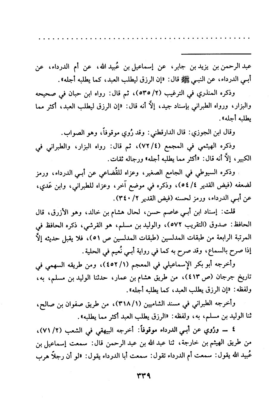 = عَبْدُ الرَّحْمَنِ بْنُ يَزِيدَ بْنِ جَابِرٍ، عَنْ إِسْمَاعِيلَ بْنِ عُبيد اللَّهِ، عَنْ أُمِّ الدَّرْدَاءِ، عَنْ أَبِي الدَّرْدَاءِ، عَنِ النَّبِيِّ -صَلَّى اللَّهُ عليه وسلم- قال: "إن الرزق ليطلب العبد، كما يطلبه أجله".