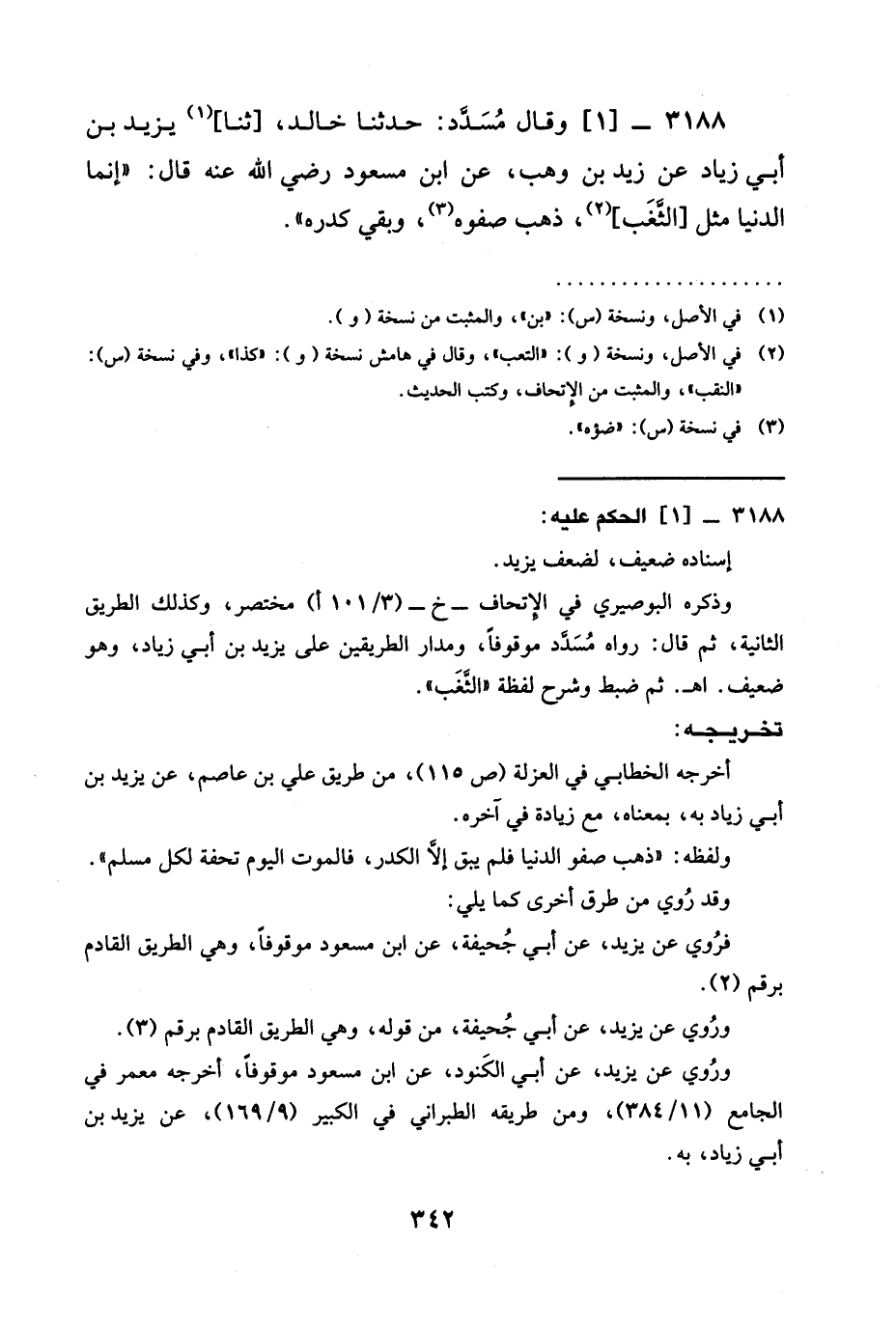 3188 -[1] وقال مُسَدَّدٌ: حدثنا خَالِدٌ، [ثنا] يَزِيدُ بْنُ أَبِي زِيَادٍ عَنْ زَيْدِ بْنِ وَهْبٍ، عَنِ ابْنِ مَسْعُودٍ رَضِيَ الله عَنْه قَالَ: " إِنَّمَا §الدُّنْيَا مِثْلُ [الثَّغَبِ] ، ذَهَبَ صَفْوُهُ، وَبَقِيَ كَدَرُهُ ".