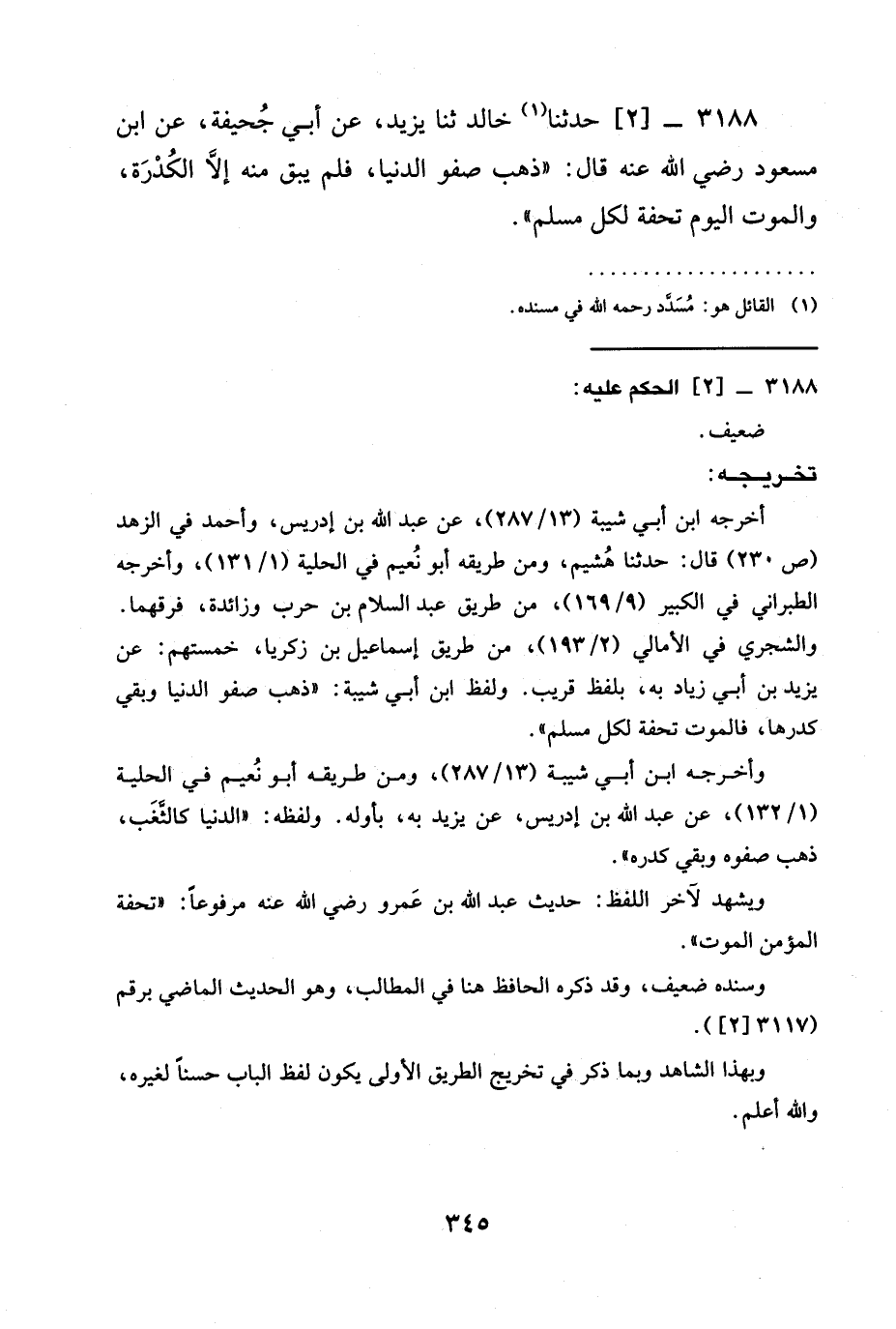 3188 -[2] حدثنا خَالِدٌ ثنا يَزِيدُ، عَنْ أَبِي جُحَيْفَةَ، عَنِ ابْنِ مَسْعُودٍ رَضِيَ الله عَنْه قَالَ: " §ذَهَبَ صَفْوُ الدُّنْيَا، فلم يبق منه إِلَّا الْكُدْرَةُ، وَالْمَوْتُ الْيَوْمَ تُحْفَةٌ لِكُلِّ مُسْلِمْ -[346]- ".