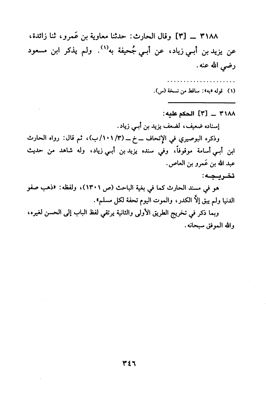 3188 - [3] وَقَالَ الْحَارِثُ: حَدَّثَنَا مُعَاوِيَةُ بْنُ عَمرو، ثنا زَائِدَةُ، عَنْ يَزِيدَ بْنِ أَبِي زِيَادٍ، عَنْ أَبِي جُحيفة بِهِ (¬1). وَلَمْ يَذْكُرِ ابْنَ مَسْعُودٍ رضي الله عنه.