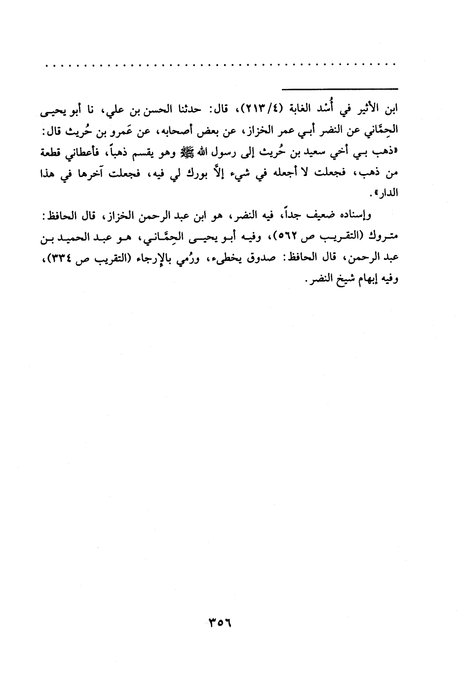 = ابن الأثير في أُسْد الغابة (4/ 213)، قال: حدّثنا الحسن بن علي، نا أبو يحيى الحِمَّاني عن النضر أبي عمر الخزاز، عن بعض أصحابه، عن عَمرو بن حُريث قال: "ذهب بي أخي سعيد بن حُريث إلى رسول الله -صلى الله عليه وسلم- وهو يقسم ذهبًا، فأعطاني قطعة من ذهب، فجعلت لا أجعله في شيء إلَّا بورك لي فيه، فجعلت آخرها في هذا الدار".