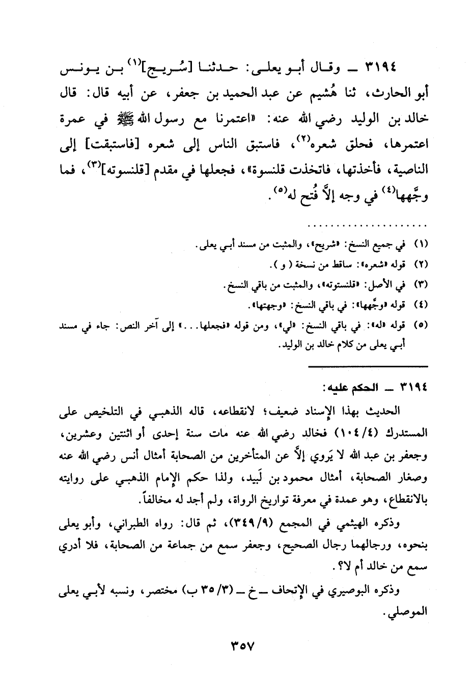 3194 - وقال أبو يعلى: حَدَّثَنَا [سُرَيْجُ] بْنُ يُونُسَ أَبُو الْحَارِثِ، ثنا هُشَيْمٌ عَنْ عَبْدِ الْحَمِيدِ بْنِ جَعْفَرٍ، عَنْ أَبِيهِ قَالَ: قَالَ خَالِدُ بْنُ الْوَلِيدِ رَضِيَ الله عَنْه: " §اعتمرنا مَعَ رَسُولِ اللَّهِ صَلَّى اللَّهُ عَلَيْهِ وَسَلَّمَ فِي عُمْرَةٍ اعْتَمَرَهَا، فَحَلَقَ شَعْرَهُ، فَاسْتَبَقَ النَّاسُ إِلَى شَعْرِهِ [فَاسْتَبَقْتُ] إِلَى الناصية، فَأَخَذْتُهَا، فَاتَّخَذْتُ قَلَنْسُوَةً "، فجعلها فِي مُقَدَّمِ [قلنسوته] ، فَمَا وجهها فِي وَجْهٍ إلا فتح له.