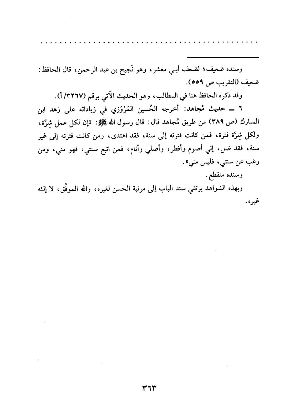 6 - حديث مُجاهد: أخرجه الحُسين المَرْوَزي في زياداته على زهد ابن المبارك (ص 389) من طريق مُجاهد قَالَ: قَالَ رَسُولُ اللَّهِ -صَلَّى اللَّهُ عَلَيْهِ وسلم-:" إن لكل عمل شِرَّة، ولكل شِرَّة فترة، فمن كانت فترته إلى سنة، فقد اهتدى، ومن كانت فترته إلى غير سنة، فقد ضل، إني أصوم وأفطر، وأصلي وأنام، فمن اتبع سنتي، فهو مني، ومن رغب عن سنتي، فليس مني".