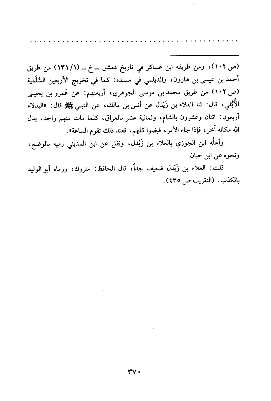 = (ص 102)، ومن طريقه ابن عساكر في تاريخ دمشق -خ- (1/ 131) من طريق أحمد بن عيسى بن هارون، والديلمي في مسنده: كما في تخريج الأربعين السُّلَمية (ص 102) من طريق محمَّد بن موسى الجوهري، أربعتهم: عن عَمرو بن يحيى الأيّلي، قال: ثنا العلاء بن زَيْدل عَنْ أَنَسِ بْنِ مَالِكٍ، عَنِ النَّبِيِّ -صَلَّى الله عليه وسلم- قال: "البدلاء أربعون: اثنان وعشرون بالشام، وثمانية عشر بالعراق، كلما مات منهم واحد، بدل الله مكانه آخر، فإذا جاء الأمر، قبضوا كلهم، فعند ذلك تقوم الساعة".