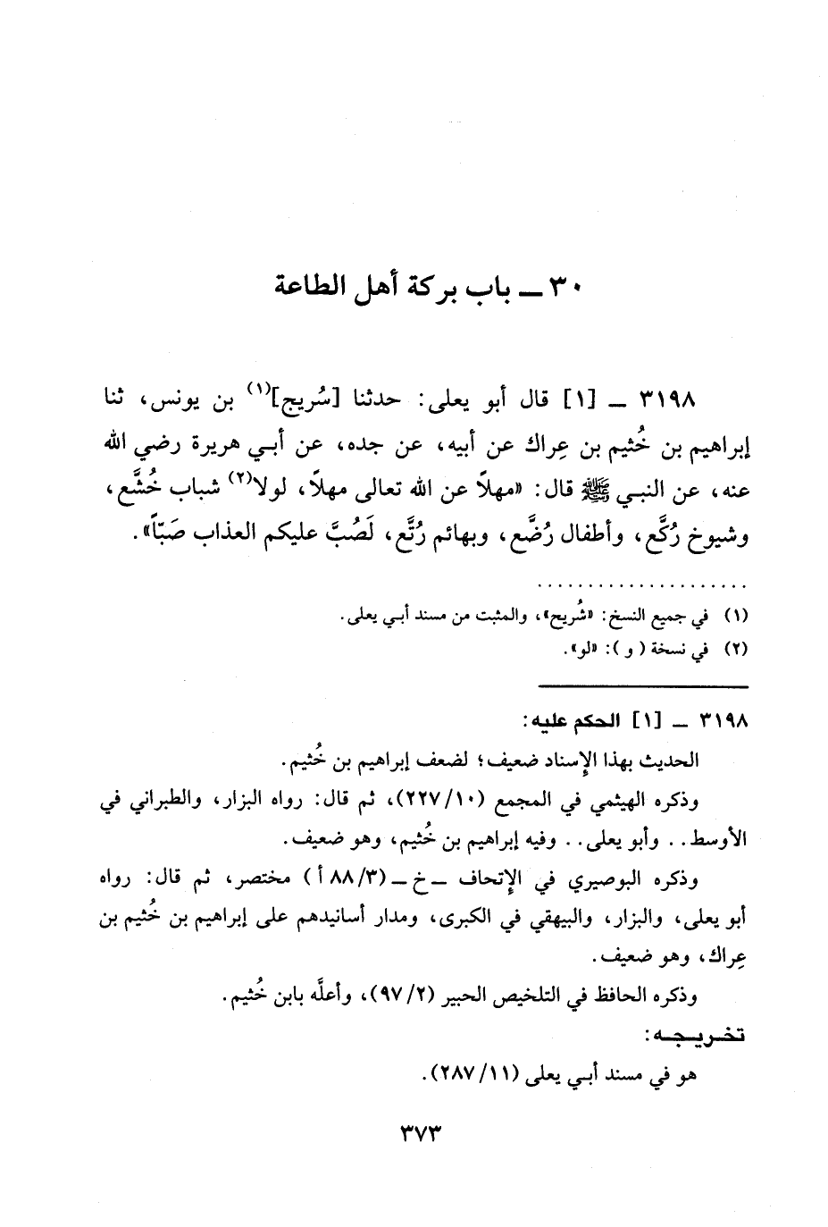 3198 -[1] قَالَ أَبُو يَعْلَى: حدثنا [سُرَيْجُ] بْنُ يُونُسَ، ثنا إِبْرَاهِيمُ بْنُ خُثَيْمِ بْنِ عِرَاكٍ عَنْ أَبِيهِ، عَنْ جَدِّهِ، عَنْ أَبِي هُرَيْرَةَ رَضِيَ الله عَنْه، عن النبي صَلَّى اللَّهُ عَلَيْهِ وَسَلَّمَ قال: " مَهْلًا عن الله تعالى مَهْلًا، §لَوْلَا شَبَابٌ خُشَّعٌ، وَشُيُوخٌ رُكَّعٌ، وَأَطْفَالٌ رُضَّعٌ، وَبَهَائِمُ رُتَّعٌ، لَصُبَّ عَلَيْكُمُ الْعَذَابُ صَبًّا -[376]- ".