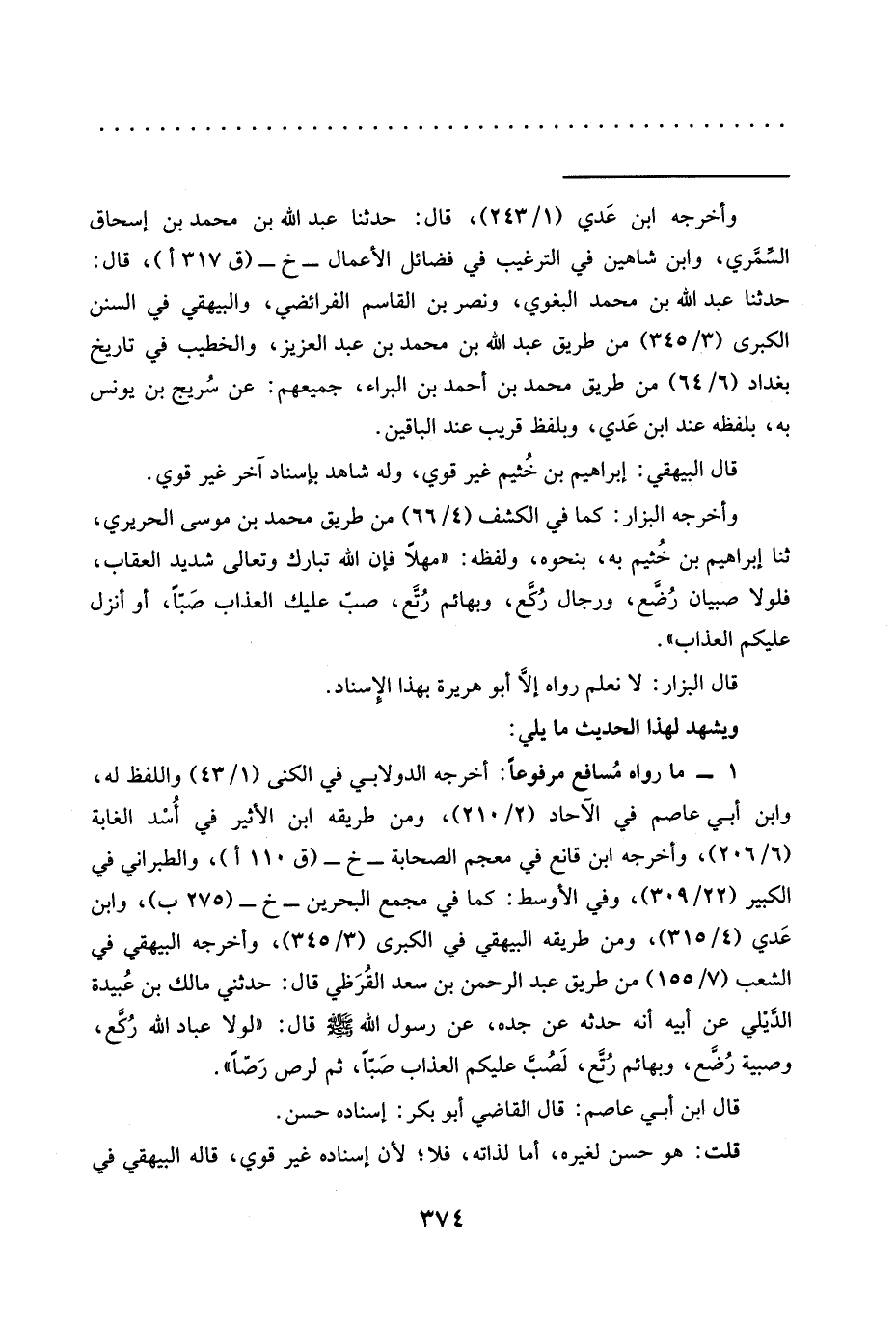 1 - ما رواه مُسافع مرفوعًا: أخرجه الدولابي في الكنى (1/ 43) واللفظ له، وابن أبي عاصم في الآحاد (2/ 210)، ومن طريقه ابن الأثير في أُسْد الغابة (6/ 206)، وأخرجه ابن قانع في معجم الصحابة -خ- (ق 110 أ)، والطبراني في الكبير (22/ 309)، وفي الأوسط: كما في مجمع البحرين -خ- (275 ب)، وابن عَدي (4/ 315)، ومن طريقه البيهقي في الكبرى (3/ 345)، وأخرجه البيهقي في الشعب (7/ 155) من طريق عبد الرحمن بن سعد القُرَظي قال: حدثني مالك بن عُبيدة الدَّيْلي عن أبيه أنه حدثه عن جده، عَنْ رَسُولِ اللَّهِ -صَلَّى اللَّهُ عَلَيْهِ وَسَلَّمَ- قال: "لولا عباد الله رُكَع، وصبية رُضَّع، وَبَهَائِمُ رُتَّع، لَصُبَّ عَلَيْكُمُ الْعَذَابُ صَبًّا، ثم لرص رَصًّا".