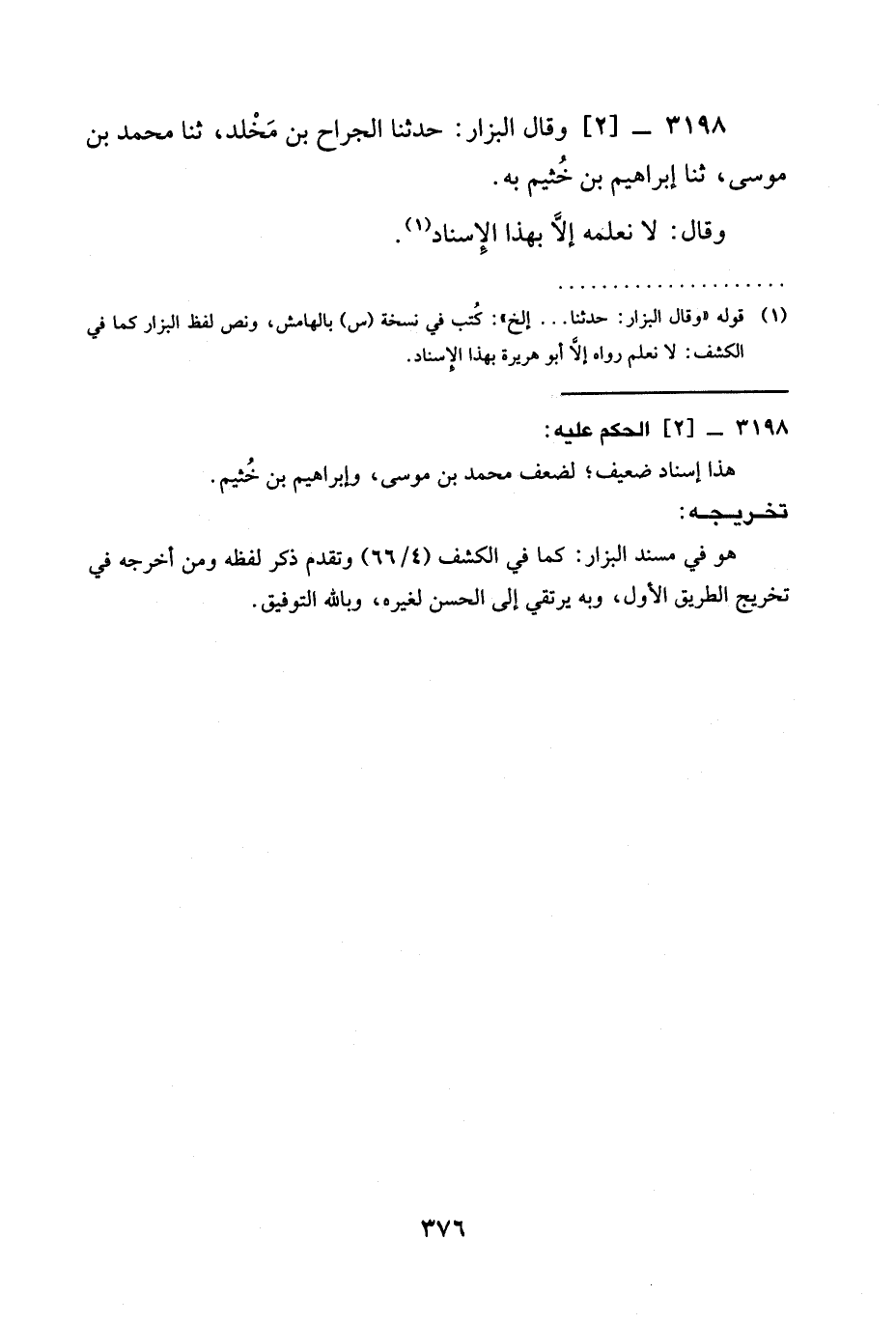 3198 - [2] وقال الْبَزَّارُ: حَدَّثَنَا الْجَرَّاحُ بْنُ مَخْلد، ثنا محمَّد بْنُ مُوسَى، ثنا إِبْرَاهِيمُ بْنُ خُثيم بِهِ.