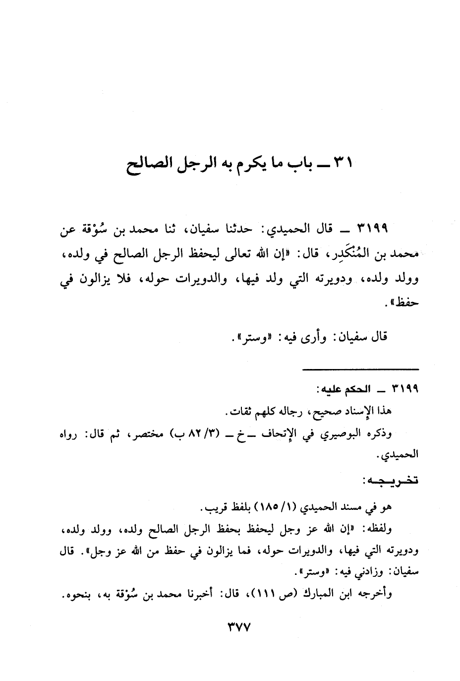 الْحُمَيْدِيُّ: حدثنا سُفْيَانُ، ثنا مُحَمَّدُ بْنُ سُوقَةَ عَنْ مُحَمَّدُ بْنِ الْمُنْكَدِرِ، قَالَ: " §إن الله تعالى لَيَحْفَظُ الرَّجُلَ الصَّالِحَ فِي وَلَدِهِ، وَوَلَدِ وَلَدِهِ، ودويرته التي ولد فِيهَا، وَالدُّوَيْرَاتِ حَوْلَهُ، فَلَا يَزَالُونَ فِي حِفْظٍ ".