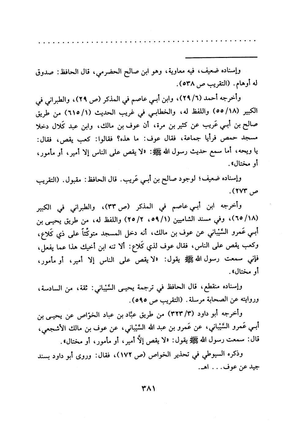 وأخرجه أحمد (6/ 29)، وابن أبي عاصم في المذكر (ص 29)، والطبراني في الكبير (18/ 55) واللفظ له، والخطابي في غريب الحديث (1/ 615) من طريق صالح بن أبي عَريب عن كثير بن مرة، أن عوف بن مالك، وابن عبد كَلال دخلا مسجد حمص فرأيا جماعة، فقال عوف: ما هذه؟ فقالوا: كعب يقص، فقال: يا ويحه، أما سمع حَدِيثِ رَسُولِ اللَّهِ -صَلَّى اللَّهُ عَلَيْهِ وَسَلَّمَ-: "لَا يقص على الناس إلا أمير، أو مأمور، أو مختال".