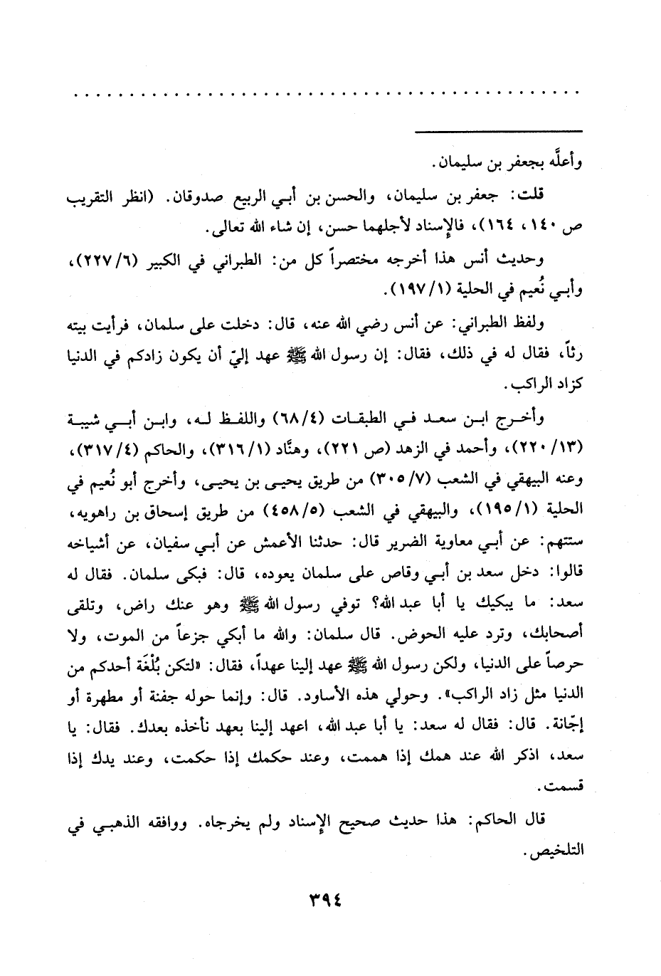 ولفظ الطبراني: عن أنس رضي الله عنه، قال: دخلت على سلمان، فرأيت بيته رثًا، فقال له في ذَلِكَ، فَقَالَ: إِنَّ رَسُولَ اللَّهِ -صَلَّى اللَّهُ عَلَيْهِ وسلم- عهد إليّ أن يكون زادكم في الدنيا كزاد الراكب. وأخرج ابن سعد في الطبقات (4/ 68) واللفظ له، وابن أبي شيبة (13/ 220)، وأحمد في الزهد (ص 221)، وهنَّاد (1/ 316)، والحاكم (4/ 317)، وعنه البيهقي في الشعب (7/ 305) من طريق يحيى بن يحيى، وأخرج أبو نُعيم في الحلية (1/ 195)، والبيهقيُّ في الشعب (5/ 458) من طريق إسحاق بن راهويه، ستتهم: عن أبي معاوية الضرير قال: حدّثنا الْأَعْمَشُ عَنْ أَبِي سُفْيَانَ، عَنْ أَشْيَاخِهِ قَالُوا: دخل سعد بن أبي وقاص على سلمان يعوده، قال: فَبَكَى سَلْمَانُ. فَقَالَ لَهُ سَعْدٌ: مَا يُبْكِيكَ يا أبا عَبْدَ اللَّهِ؟ تُوُفِّيَ رَسُولُ اللَّهِ -صَلَّى اللَّهُ عَلَيْهِ وَسَلَّمَ- وهو عنك راض، وتلقى أصحابك، وترد عليه الحوض. قال سلمان: والله ما أبكي جزعًا من الموت، ولا حرصا على الدنيا، وَلَكِنَّ رَسُولَ اللَّهِ -صَلَّى اللَّهُ عَلَيْهِ وَسَلَّمَ- عَهِدَ إلينا عهدًا، فقال: "لتكن بُلْغَة أحدكم من الدنيا مثل زاد الراكب". وحولي هذه الأساود. قال: وإنما حوله جفنة أو مطهرة أو إجّانة. قال: فقال له سعد: يا أبا عبد الله، اعهد إلينا بعهد نأخذه بعدك. فقال: يا سعد، اذكر الله عند همك إذا هممت، وعند حكمك إذا حكمت، وعند يدك إذا قسمت.