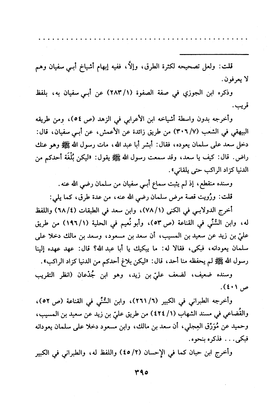 قلت: ورُويت قصة مرض سلمان رضي الله عنه، من عدة طرق، كما يلي: أخرج الدولابي في الكنى (1/ 78)، وابن سعد في الطبقات (4/ 68) واللفظ له، وابن السُّنِّي في القناعة (ص 53)، وأبو نُعيم في الحلية (1/ 196) من طريق عَلِيِّ بْنِ زَيْدٍ عَنْ سَعِيدِ بْنِ الْمُسَيِّبِ، أن سعد بن مسعود، وسعد بن مالك دخلا على سلمان يعودانه، فبكى، فقالا له: ما يبكيك يا أبا عبد الله؟ قال: عهد عهده إِلَيْنَا رَسُولُ اللَّهِ -صَلَّى اللَّهُ عَلَيْهِ وَسَلَّمَ- لم يحفظه منا أحد، قال: "ليكن بلاغ أحدكم من الدنيا كزاد الراكب".