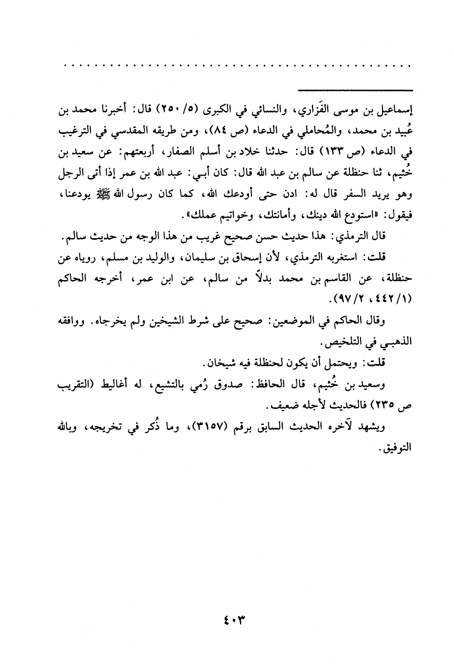 = إسماعيل بن موسى الفَزاري، والنسائيُّ في الكبرى (5/ 250) قال: أخبرنا محمَّد بن عُبيد بن محمَّد، والمُحاملي في الدعاء (ص 84)، ومن طريقه المقدسي في الترغيب في الدعاء (ص 133) قال: حدّثنا خلاد بن أسلم الصفار، أربعتهم: عن سعيد بن خُثيم، ثنا حنظلة عن سالم بن عبد الله قال: كان أبي: عبد الله بن عمر إذا أتى الرجل وهو يريد السفر قال له: ادن حتى أودعك الله، كما كَانَ رَسُولُ اللَّهِ -صَلَّى اللَّهُ عَلَيْهِ وَسَلَّمَ- يودعنا، فيقول: "استودع الله دينك، وأمانتك، وخواتيم عملك".
