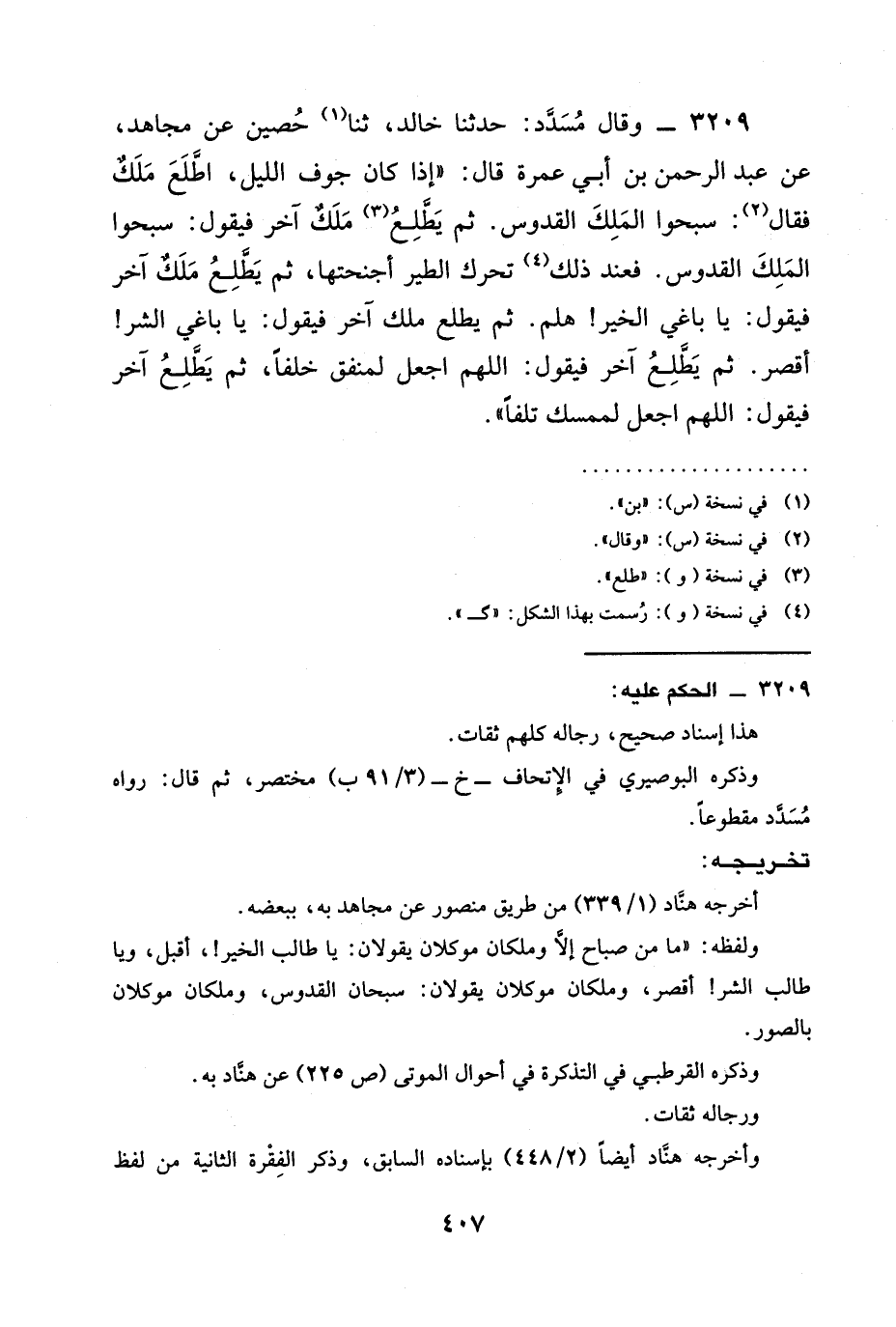 3209 - وقال مُسَدَّدٌ: حدثنا خَالِدٌ ثنا حُصَيْنٌ عَنْ مُجَاهِدٍ، عَنْ عَبْدِ الرَّحْمَنِ بْنِ أَبِي عَمْرَةَ قَالَ: " إِذَا كَانَ جَوْفُ اللَّيْلِ، اطَّلَعَ مَلَكٌ فقا: سحبوا الْمَلِكَ الْقُدُّوسَ. ثُمَّ يَطَّلِعُ مَلَكٌ آخَرُ فَيَقُولُ: سَبِّحُوا الْمَلِكَ الْقُدُّوسَ. فَعِنْدَ ذَلِكَ تُحَرِّكُ الطَّيْرُ أَجْنِحَتَهَا، ثُمَّ يَطَّلِعُ مَلَكٌ آخَرُ فَيَقُولُ: يَا بَاغِيَ الْخَيْرِ! هَلُمَّ. ثُمَّ يَطَّلِعُ مَلَكٌ آخر فيقول: يَا بَاغِيَ الشَّرِّ! أَقْصِرْ. ثُمَّ يَطَّلِعُ آخَرُ فَيَقُولُ: §اللَّهُمَّ اجْعَلْ لِمُنْفِقٍ خَلْفًا، ثُمَّ يَطَّلِعُ آخَرُ فَيَقُولُ: اللَّهُمَّ اجْعَلْ لِمُمْسِكٍ تَلَفًا ".