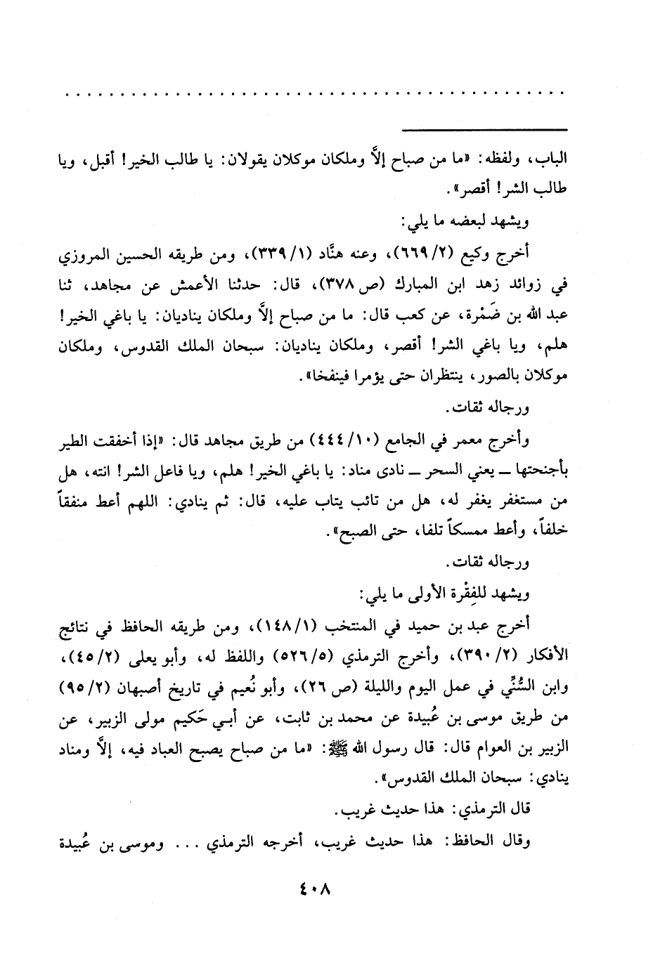 = الباب، ولفظه: "ما من صباح إلَّا وملكان موكلان يقولان: يا طالب الخير! أقبل، ويا طالب الشر! أقصر!.