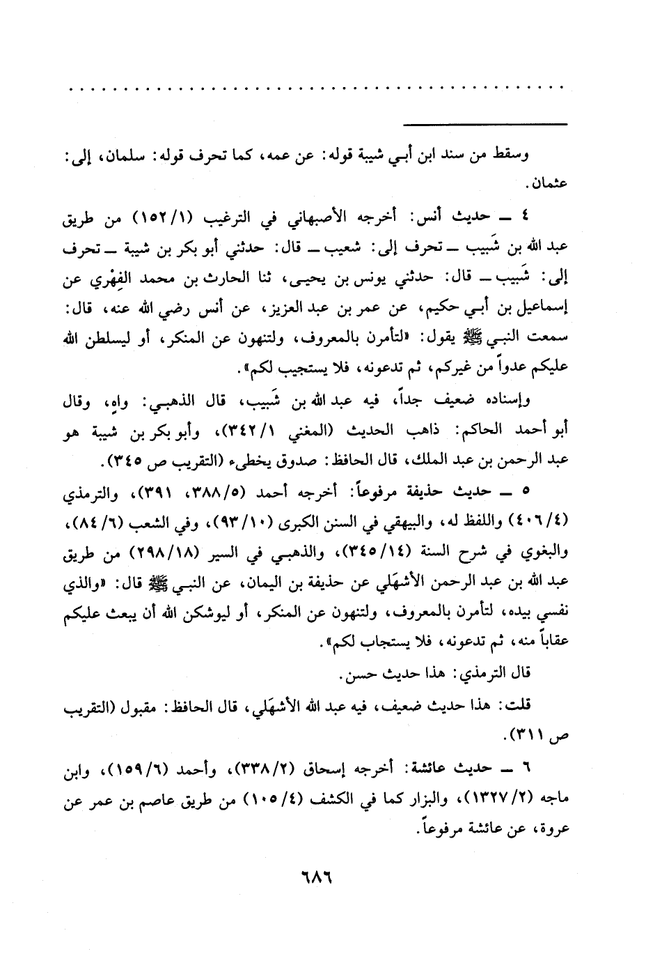 4 - حديث أنس: أخرجه الأصبهاني في الترغيب (1/ 152) من طريق عبد الله بن شَبيب -تحرف إلى: شعيب- قال: حدثني أبو بكر بن شيبة -تحرف إلى: شَبيب- قال: حدثني يونس بن يحيى، ثنا الحارث بن محمَّد الفِهْري عَنْ إِسْمَاعِيلَ بْنِ أَبِي حَكِيمٍ، عَنْ عُمَرَ بن عبد العزيز، عن أنس رضي الله عنه، قَالَ: سَمِعْتُ النَّبِيَّ -صَلَّى اللَّهُ عَلَيْهِ وَسَلَّمَ-يقول: "لَتَأْمُرُنَّ بِالْمَعْرُوفِ، وَلَتَنْهَوُنَّ عَنِ الْمُنْكَرِ، أَوْ لَيُسَلِّطَنَّ الله عليكم عدوًا من غيركم، ثم تدعونه، فلا يستجيب لكم".