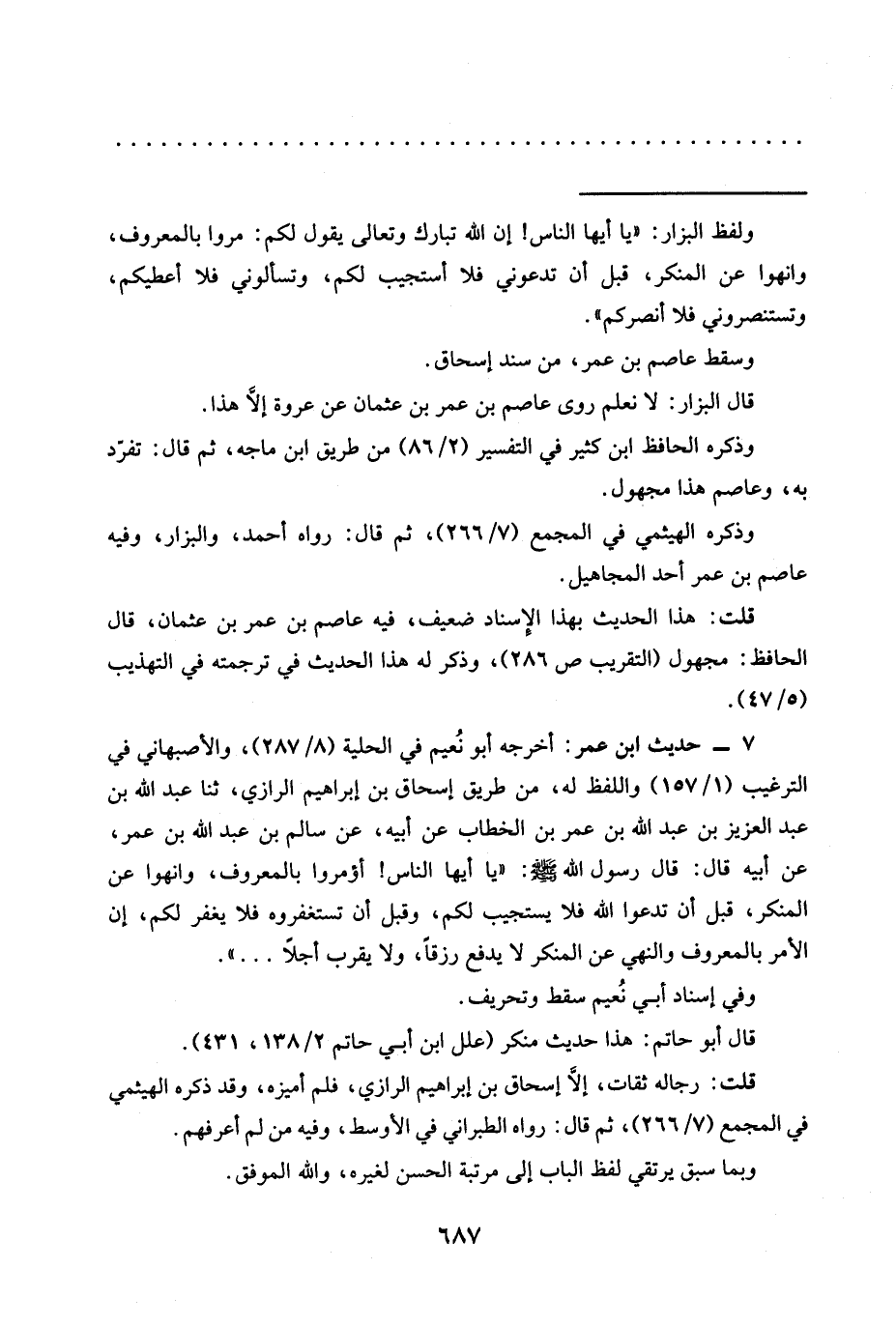 7 - حديث ابن عمر: أخرجه أبو نُعيم في الحلية (8/ 287)، والأصبهاني في الترغيب (1/ 157) واللفظ له، من طريق إسحاق بن إبراهيم الرازي، ثنا عبد الله بن عبد العزيز بن عَبْدِ اللَّهِ بْنِ عُمَرَ بْنِ الْخَطَّابِ عَنْ أبيه، عَنْ سَالِمِ بْنِ عَبْدِ اللَّهِ بْنِ عُمَرَ، عَنْ أَبِيهِ قَالَ: قَالَ رَسُولُ اللَّهِ -صَلَّى الله عليه وسلم-: "يا أيها الناس! أؤمروا بِالْمَعْرُوفِ، وَانْهَوْا عَنِ الْمُنْكَرِ، قَبْلَ أَنْ تَدْعُوا الله فلا يستجيب لكم، وقبل أن تستغفروه فلا يغفر لكم، إن الأمر بالمعروف والنهي عن المنكر لا يدفع رزقًا، ولا يقرب أجلًا ... ".