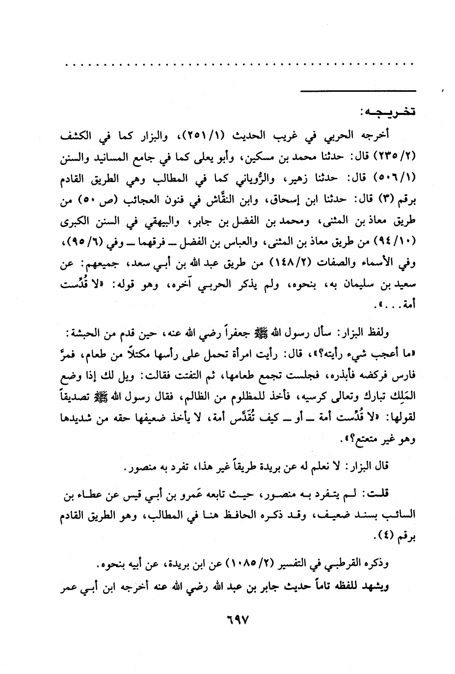 ولفظ البزّار: سَأَلَ رَسُولَ اللَّهِ -صَلَّى اللَّهُ عَلَيْهِ وَسَلَّمَ- جعفرًا رضي الله عنه، حين قدم من الحبشة: "ما أعجب شيء رأيته؟ "، قال: رأيت امرأة تحمل على رأسها مكتلًا من طعام، فمرّ فارس فركضه فأبذره، فجلست تجمع طعامها، ثم التفتت فقالت: ويل لك إذا وضع المَلِك تبارك وتعالى كرسيه، فأخذ لِلْمَظْلُومِ مِنَ الظَّالِمِ، فَقَالَ رَسُولُ اللَّهِ -صَلَّى اللَّهُ عَلَيْهِ وَسَلَّمَ- تَصْدِيقًا لِقَوْلِهَا: "لَا قُدِّست أمة -أَوْ- كَيْفَ تُقَدَّس أُمَّةٌ، لَا يَأْخُذُ ضَعِيفُهَا حقه من شديدها وهو غير متعتع؟ ".