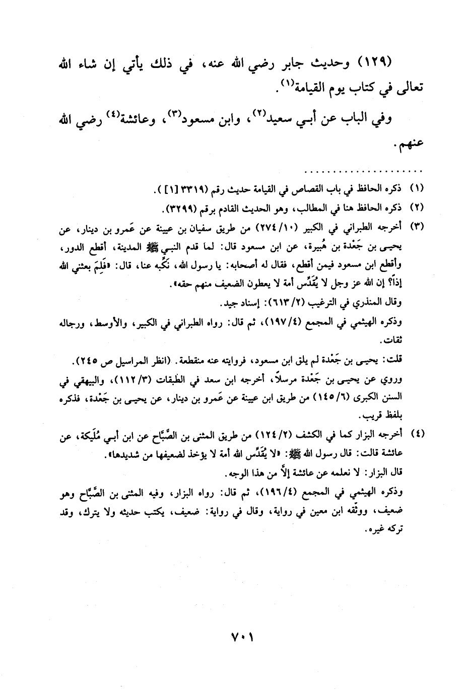 (¬4) أخرجه البزّار كما في الكشف (2/ 124) من طريق المثنى بن الصَّبّاح عن ابن أبي مُلَيكة، عن عائشة قالت: قال رسول الله -صلى الله عليه وسلم-: "لاُ يُقَدِّس الله أمة لا يؤخذ لضعيفها من شديدها".