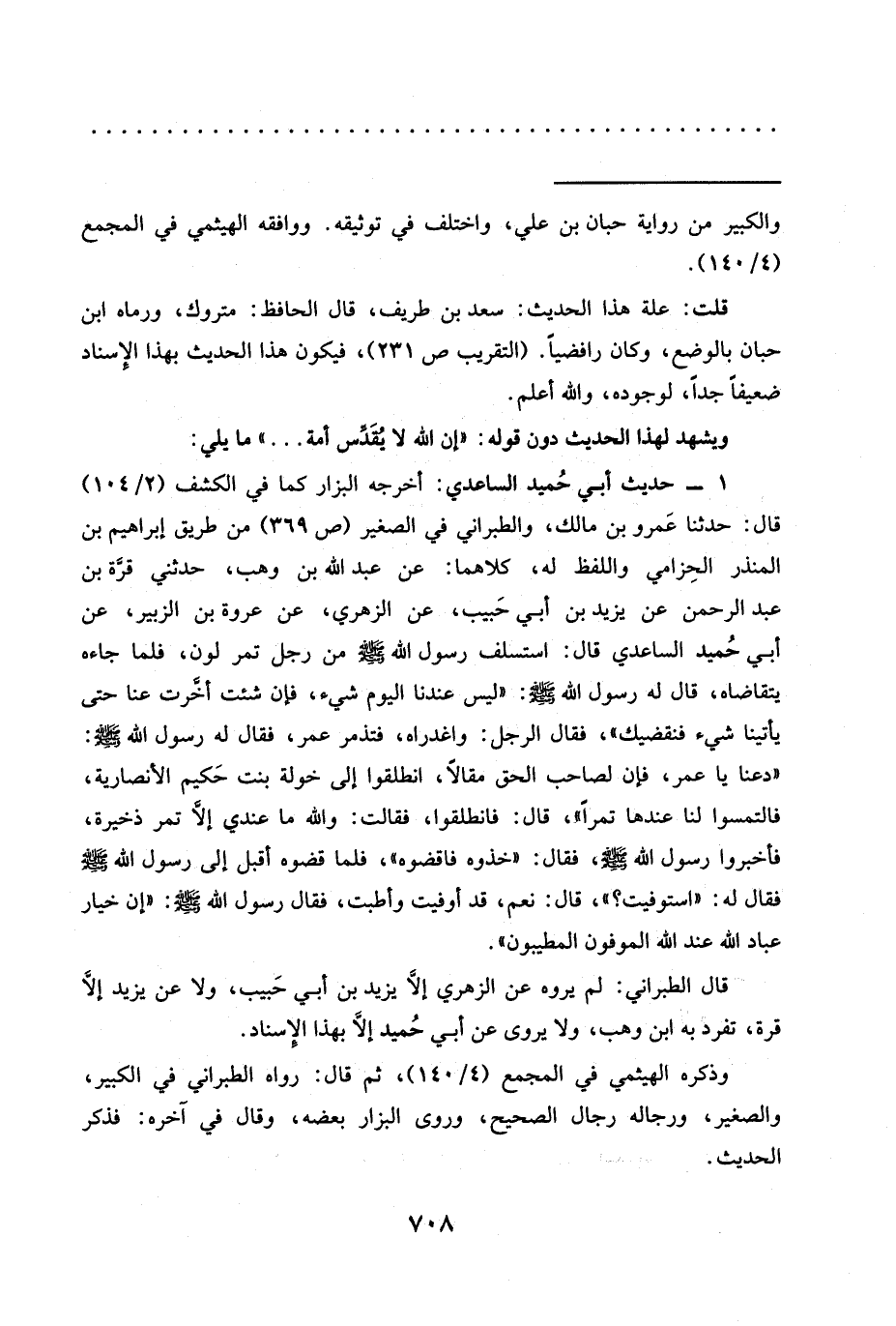 1 - حديث أبي حُميد الساعدي: أخرجه البزّار كما في الكشف (2/ 104) قال: حدّثنا عَمرو بن مالك، والطبراني في الصغير (ص 369) من طريق إبراهيم بن المنذر الحِزامي واللفظ له، كلاهما: عن عبد الله بن وهب، حدثني قرة بن عبد الرحمن عن يزيد بن أبي حَبيب، عن الزهري، عن عروة بن الزبير، عن أبي حُميد الساعدي قال: استسلف رسول الله -صلى الله عليه وسلم- من رجل تمر لون، فلما جاءه يتقاضاه، قَالَ لَهُ رَسُولُ اللَّهِ -صَلَّى اللَّهُ عَلَيْهِ وسلم-: "ليس عندنا اليوم شيء، فإن شئت أخرت عنا حتى يأتينا شيء فنقضيك"، فقال الرجل: واغدراه، فتذمر عمر، فَقَالَ لَهُ رَسُولُ اللَّهِ -صَلَّى اللَّهُ عَلَيْهِ وسلم-: "دعنا يا عمر، فإن لصاحب الحق مقالًا، انطلقوا إلى خولة بنت حَكيم الأنصارية، فالتمسوا لنا عندها تمرًا"، قال: فانطلقوا، فقالت: والله ما عندي إلَّا تمر ذخيرة، فأخبروا رسول الله -صلى الله عليه وسلم-، فقال: "خذوه فاقضوه"، فلما قضوه أقبل إلى رسول الله -صلى الله عليه وسلم- فقال له: "استوفيت؟ "، قال: نعم، قد أوفيت وأطبت، فَقَالَ رَسُولُ اللَّهِ -صَلَّى اللَّهُ عَلَيْهِ وَسَلَّمَ-: "إن خيار عباد الله عند الله الموفون المطيبون".