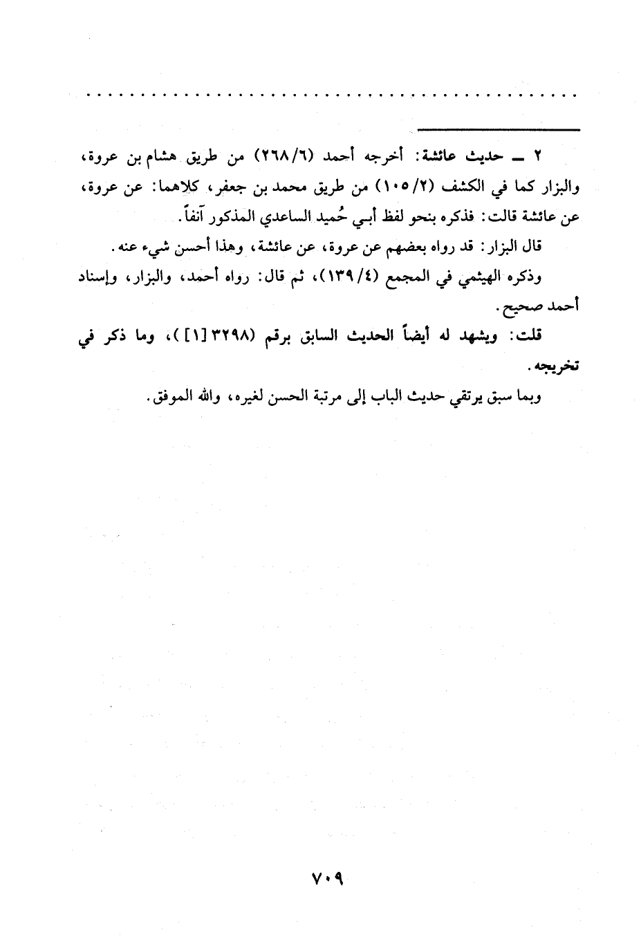 = 2 - حديث عائشة: أخرجه أحمد (6/ 268) من طريق هشام بن عروة، والبزار كما في الكشف (2/ 105) من طريق محمَّد بن جعفر، كلاهما: عن عروة، عن عائشة قالت: فذكره بنحو لفظ أبي حُميد الساعدي المذكور آنفًا.