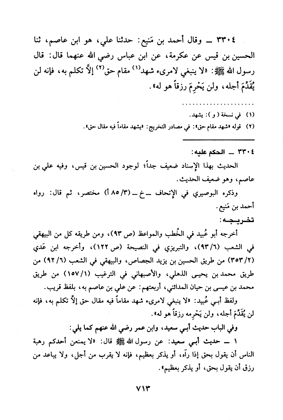 3304 - وقال أَحْمَدُ بْنُ مَنِيعٍ: حدثنا عَلِيٌ، هُوَ ابْنُ عَاصِمٍ، ثنا الحسين بْنُ قَيْسٍ عَنْ عِكْرِمَةَ، عَنِ ابن عباس رَضِيَ الله عَنْهما قَالَ: قَالَ رَسُولُ اللَّهِ صَلَّى اللَّهُ عَلَيْهِ وَسَلَّمَ: " §لَا ينبغي لامرئ شهد مَقَامَ حَقٍّ إِلَّا تَكَلَّمَ بِهِ، فَإِنَّهُ لَنْ يُقَدِّمَ أجله، ولن يَحْرِمَ رِزْقًا هُوَ لَهُ ".