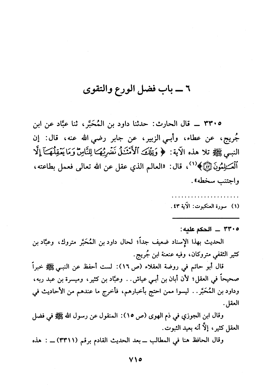3305 - قَالَ الْحَارِثُ: حدثنا دَاوُدُ بْنُ الْمُحَبَّرِ، ثنا عَبَّادٌ عَنِ ابْنِ جُرَيْجٍ، عَنْ عَطَاءٍ، وَأَبِي الزُّبَيْرِ، عن جابر رَضِيَ الله عَنْه، قال: أَنَّ النَّبِيَّ صَلَّى اللَّهُ عَلَيْهِ وَسَلَّمَ تَلَا هَذِهِ الْآيَةَ: {§وَتِلْكَ الْأَمْثَالُ نَضْرِبُهَا لِلنَّاسِ وَمَا يَعْقِلُهَا إِلاَّ العَالِمُون (43) } ، قال: " الْعَالِمُ الَّذِي عَقَلَ عن الله تعالى فَعَمِلَ بِطَاعَتِهِ، وَاجْتَنَبَ سَخَطَهُ ".