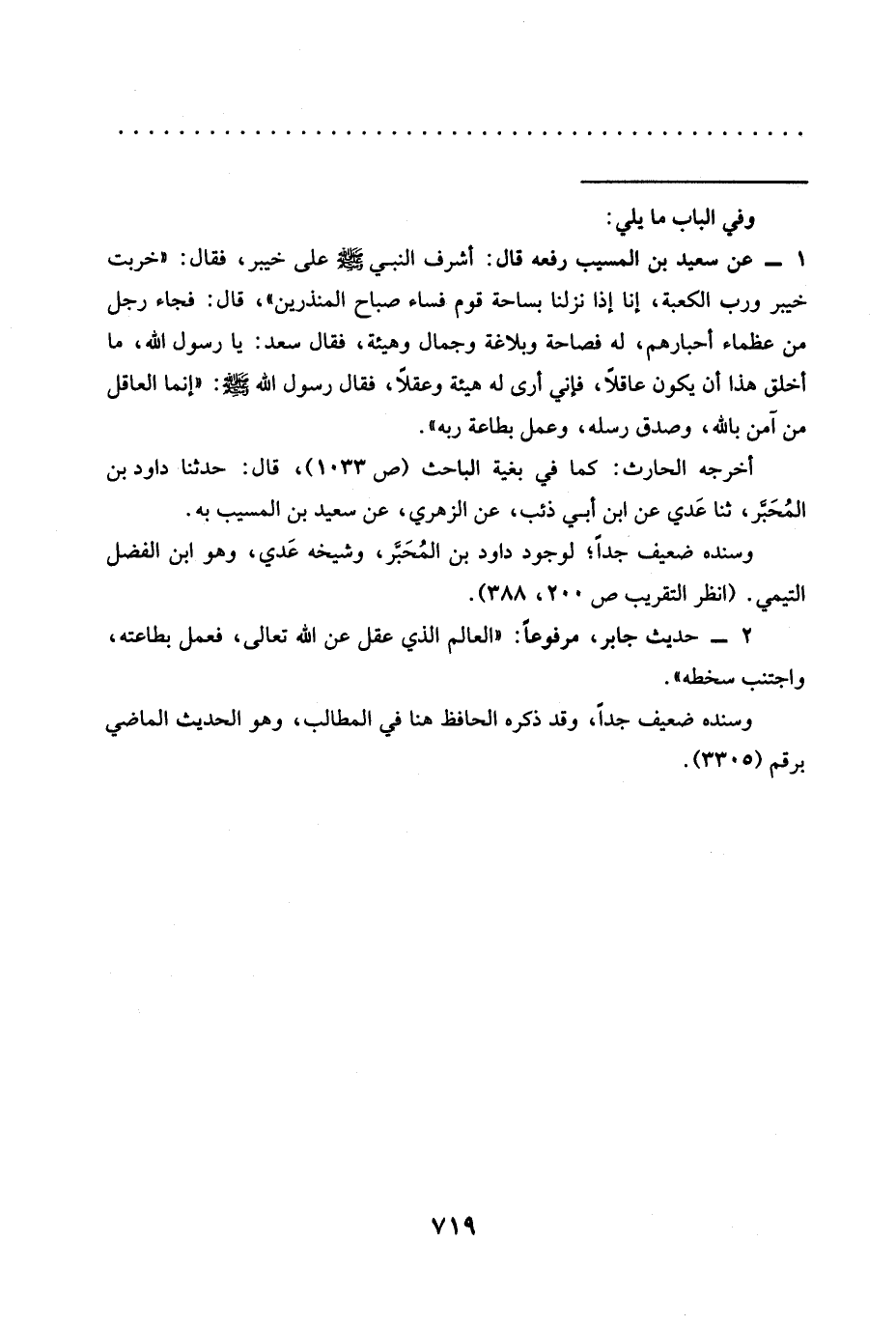 1 - عن سعيد بن المسيّب رفعه قال: أشرف النبي -صلى الله عليه وسلم-على خيبر، فقال: "خربت خيبر ورب الكعبة، إنا إذا نزلنا بساحة قوم فساء صباح المنذرين"، قال: فجاء رجل من عظماء أحبارهم، له فصاحة وبلاغة وجمال وهيئة، فقال سعد: يا رسول الله، ما أخلق هذا أن يكون عاقلًا، فإني أرى له هيئة وعقلًا، فَقَالَ رَسُولُ اللَّهِ -صَلَّى اللَّهُ عَلَيْهِ وَسَلَّمَ-: "إنما العاقل من آمن بالله، وصدق رسله، وعمل بطاعة ربه".