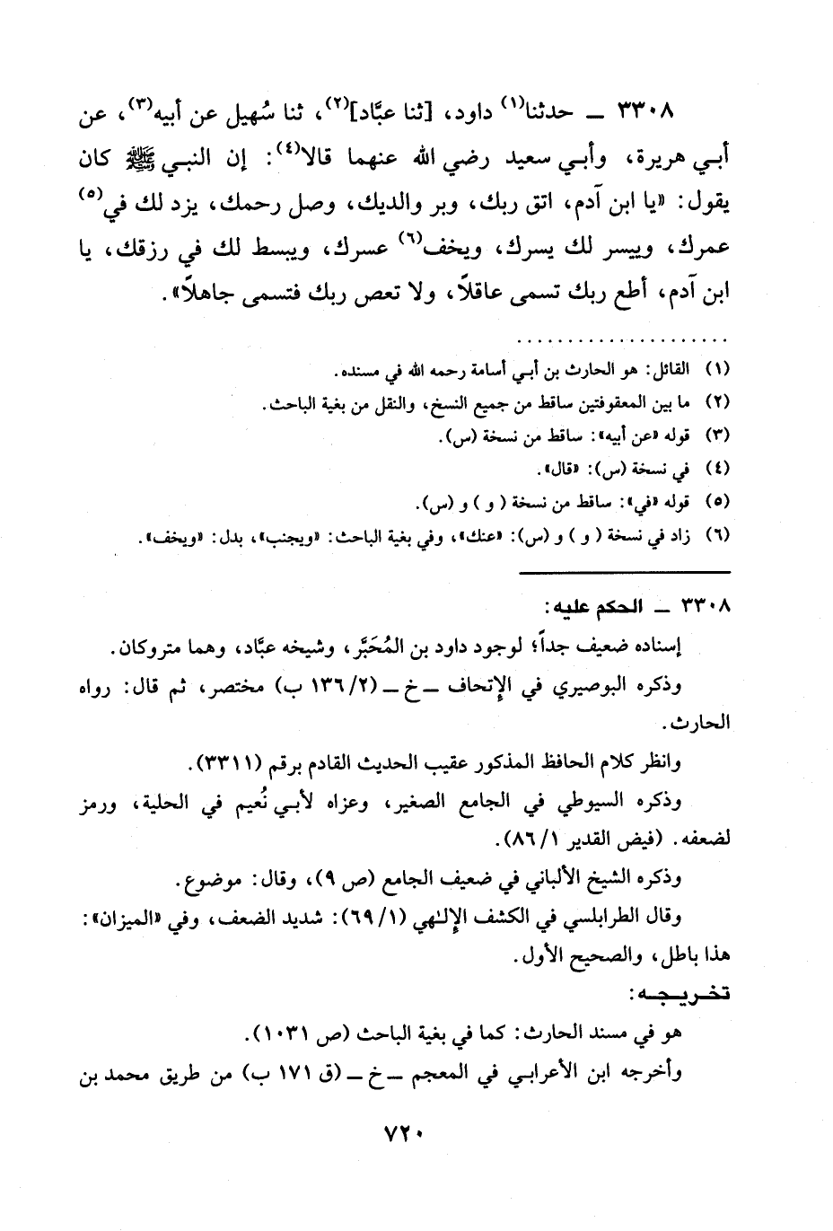 3308 - حَدَّثَنَا دَاوُدَ، [ثنا عبَّاد] ، ثنا سُهَيْلٍ عَنْ أَبِيهِ، عَنْ أَبِي هُرَيْرَةَ، وأبي سعيد رَضِيَ الله عَنْهما قالا: أَنَّ النَّبِيَّ صَلَّى اللَّهُ عَلَيْهِ وَسَلَّمَ كَانَ يَقُولُ: " §يَا ابْنَ آدَمَ، اتَّقِ رَبَّكَ، وَبِرَّ وَالِدَيْكَ، وَصِلْ رَحِمَكَ، يُزَدْ لَكَ فِي عُمْرِكَ، وَيُيَسَّرْ لك يسرك، ويخف عُسْرَكَ، وَيُبْسَطْ لَكَ فِي رِزْقِكَ، يَا ابْنَ آدَمَ، أَطِعْ رَبَّكَ تُسَمَّى عَاقِلًا، وَلَا تَعْصِ رَبَّكَ فَتُسَمَّى جَاهِلًا ".